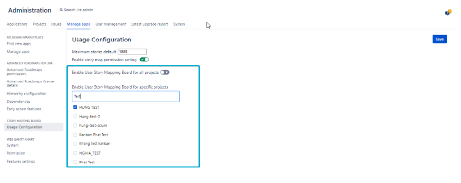 3つ目のオプションは、オフに設定されている場合、プロジェクトのリストが表示されます。ユーザーは、必要なプロジェクトだけを絞り込んで、ストーリーマッピングボード機能を有効にすることができます。