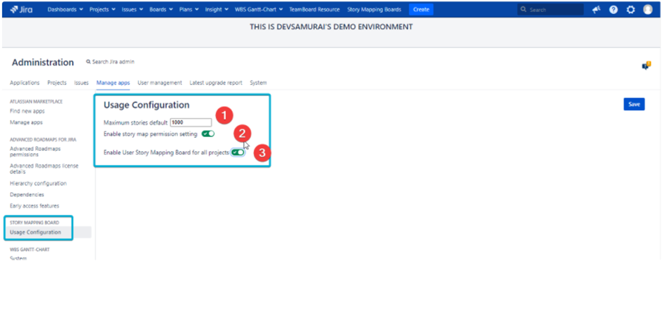次に、左メニューの [ストーリー マッピング ボード] セクションを検索し、[使用状況設定] をクリックします。