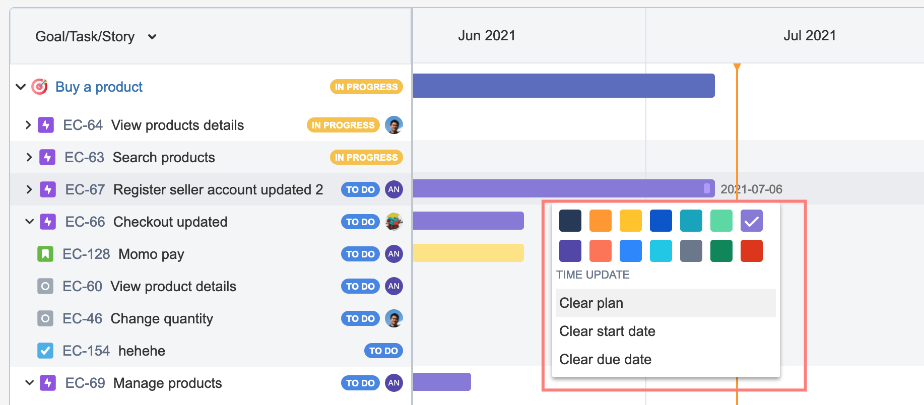 Roadmap bar menu: right-click the bar on the roadmap to open the menu, users can change color or clear the plan