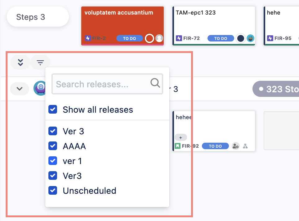 Swimlane filter: select to show or hide specific releases or sprint swimlanes