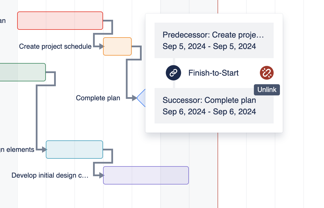 In ConfluPlan Gantt chart for Confluence, you can create dependencies between tasks in your project.