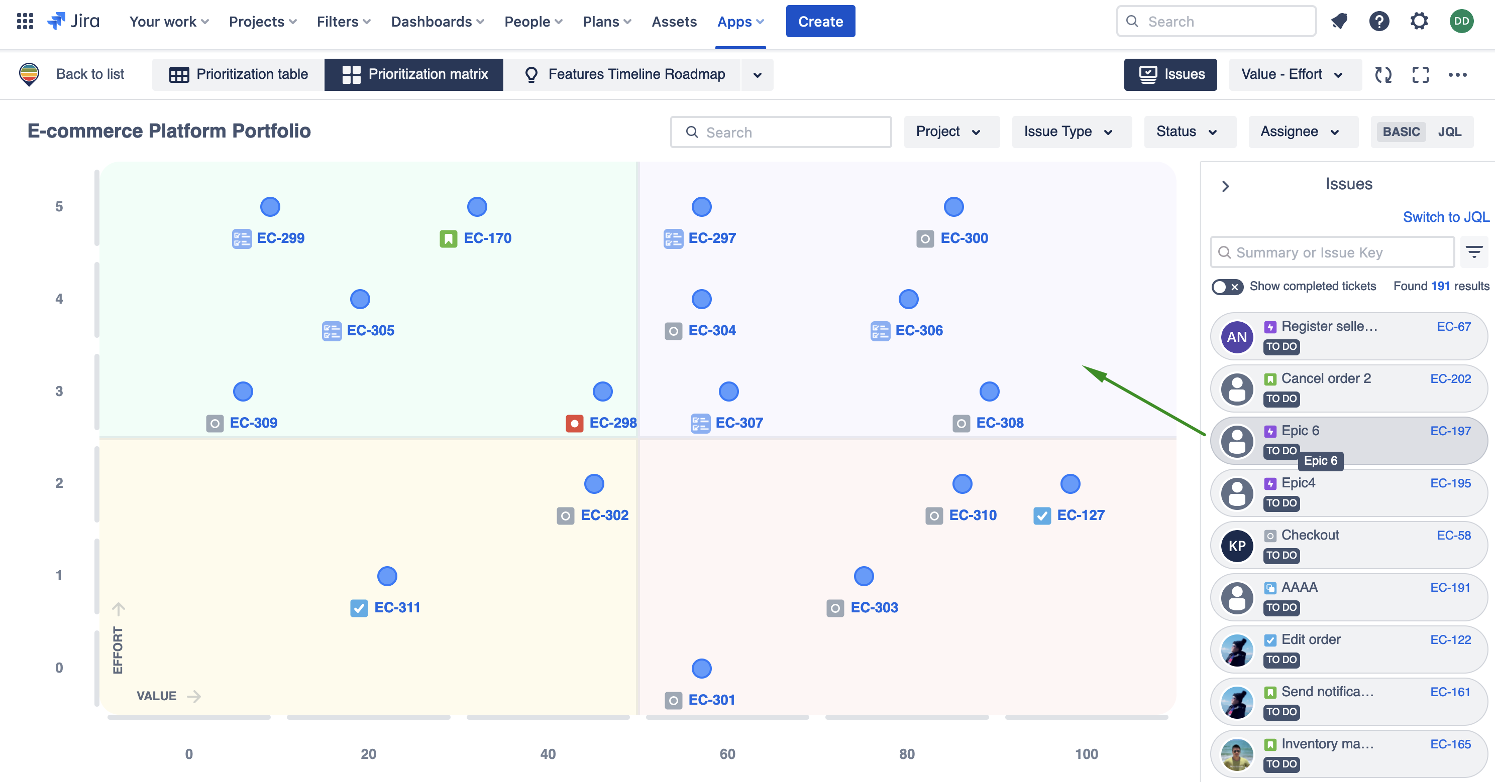 Drag & drop Issues from Issues box into Matrix to prioritize