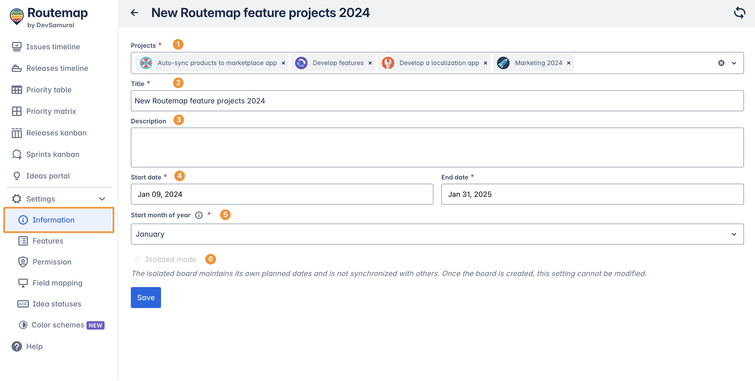 Isolated mode: allows you to create a board with its own planned dates and not sync with other boards. This option can only be turned on when creating a new board and cannot be changed.