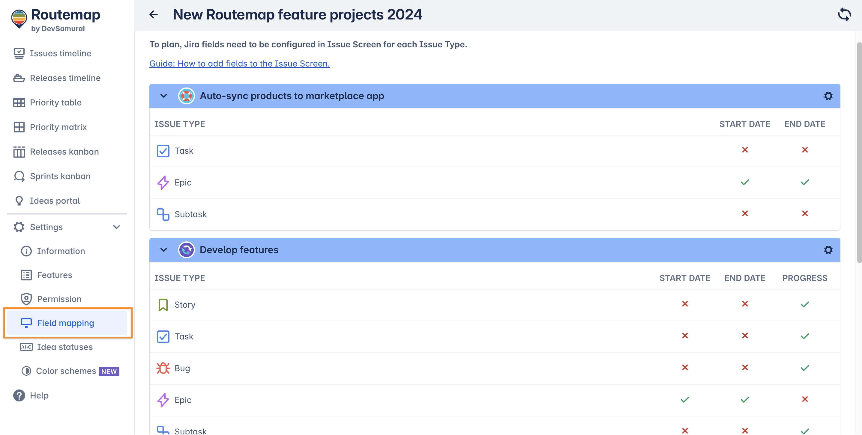 This is where you can map Routemap’s date fields to Jira fields in your projects added to the board. Keep in mind that the data on existing boards included in current projects may change.