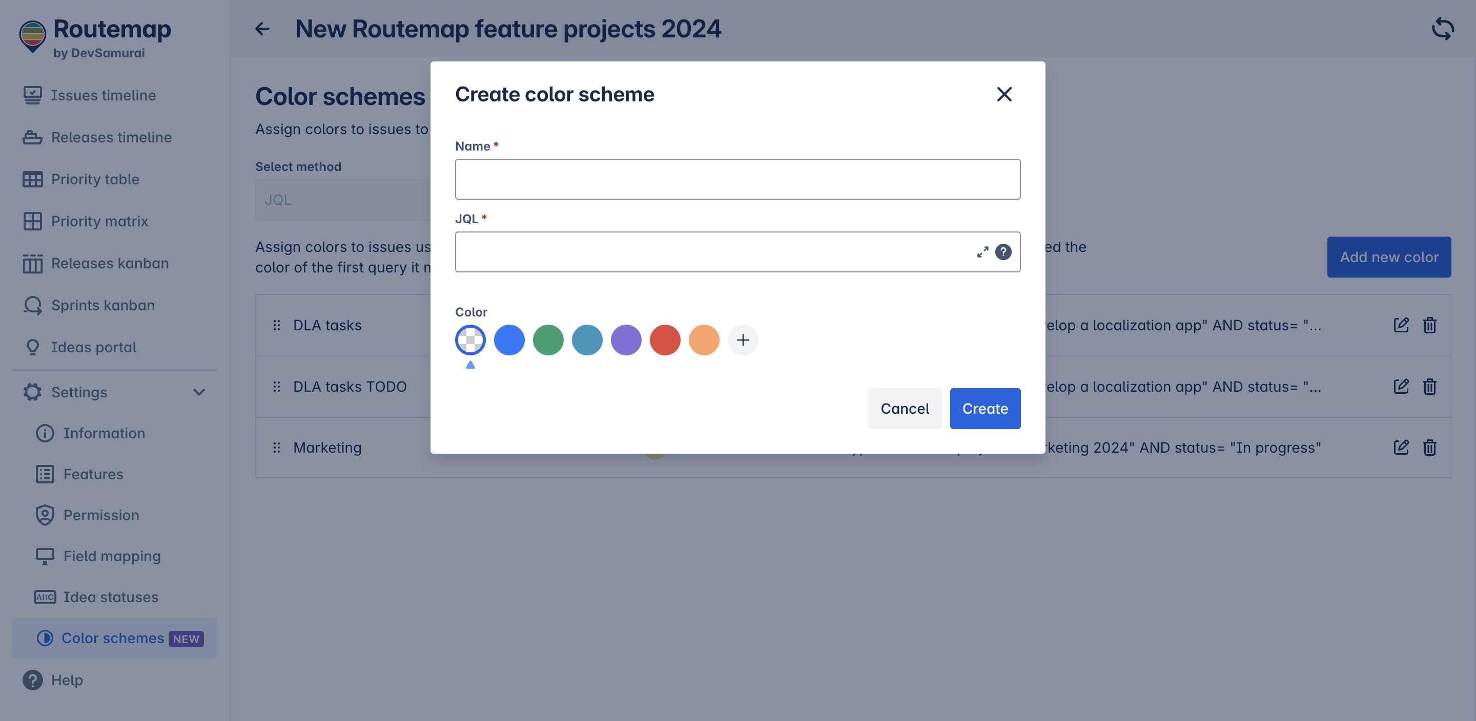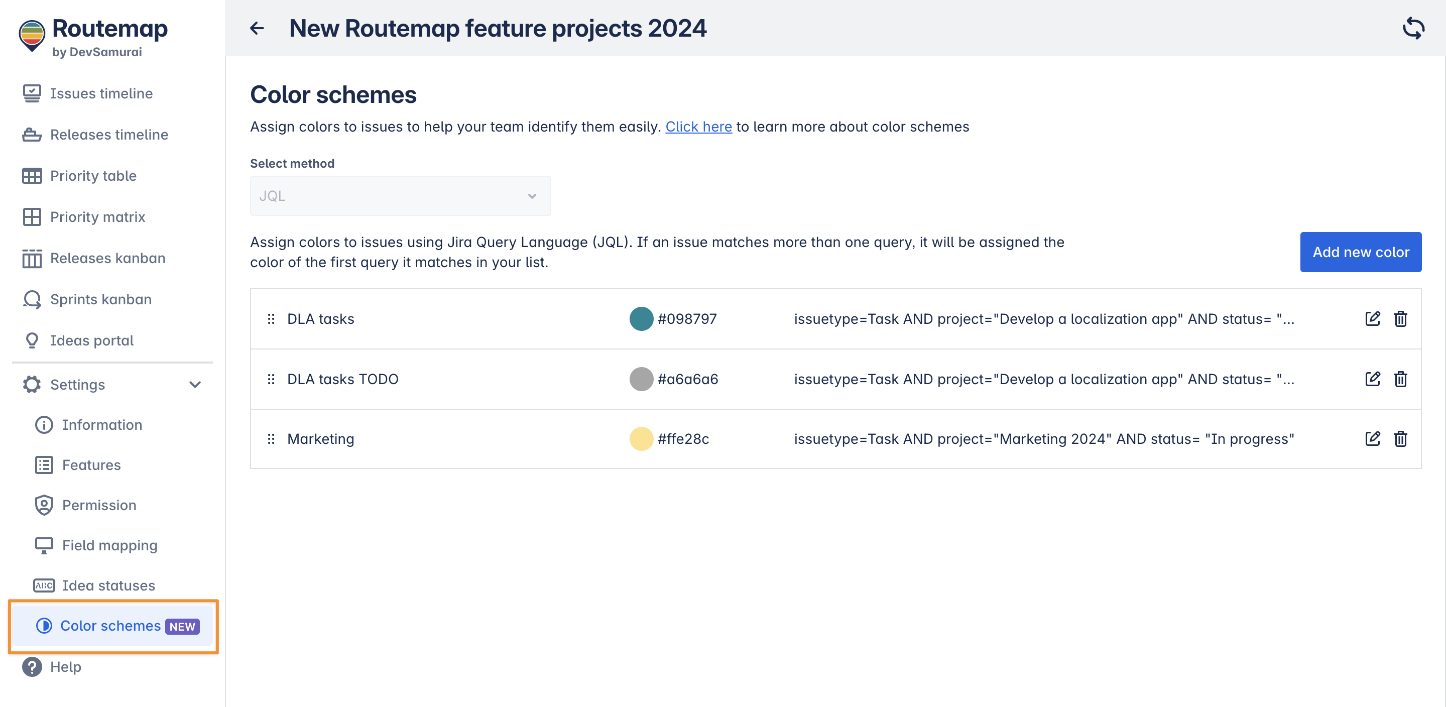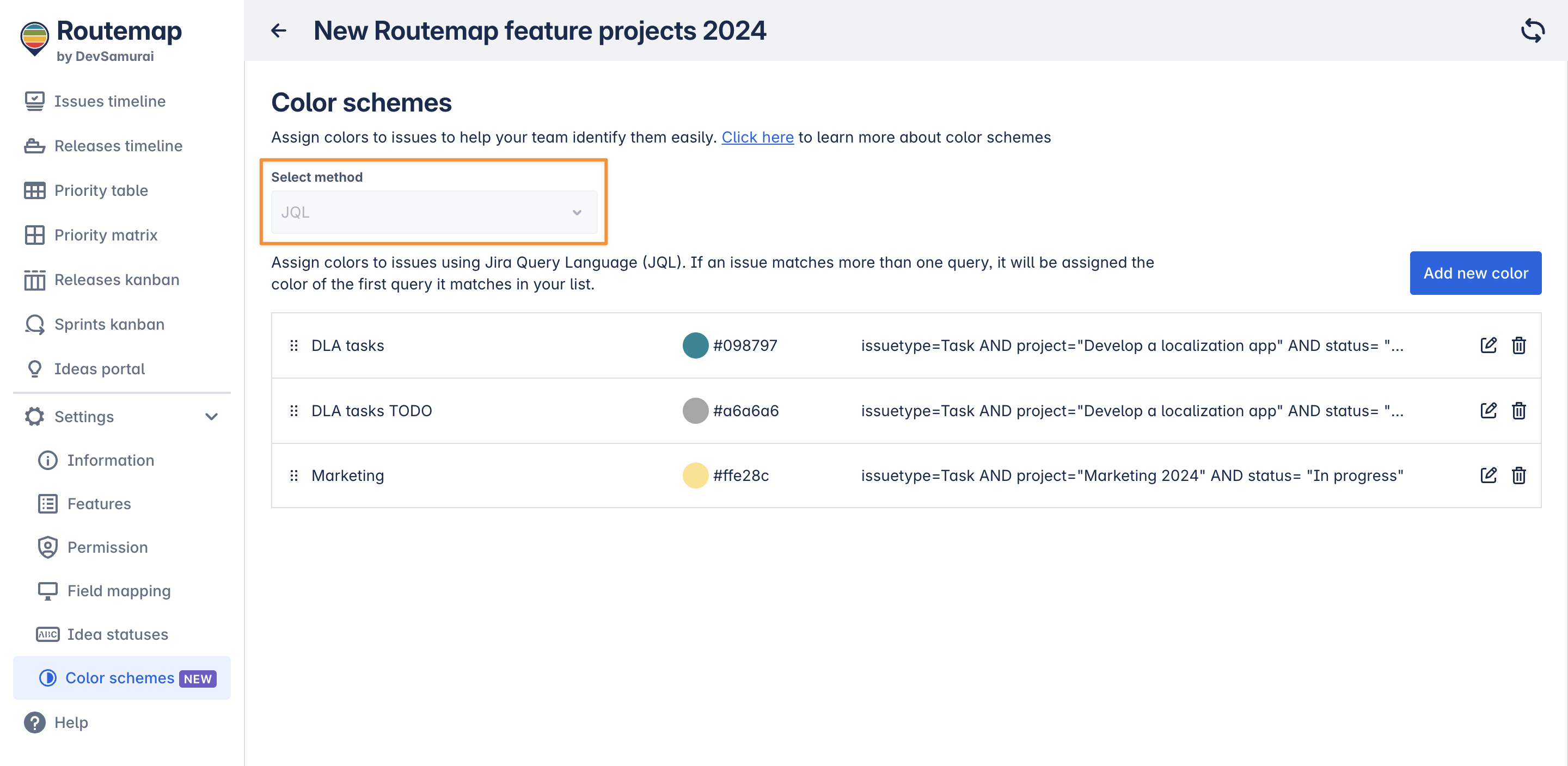 Currently, Routemap only supports the JQL method to help you define the condition for your color schemes.