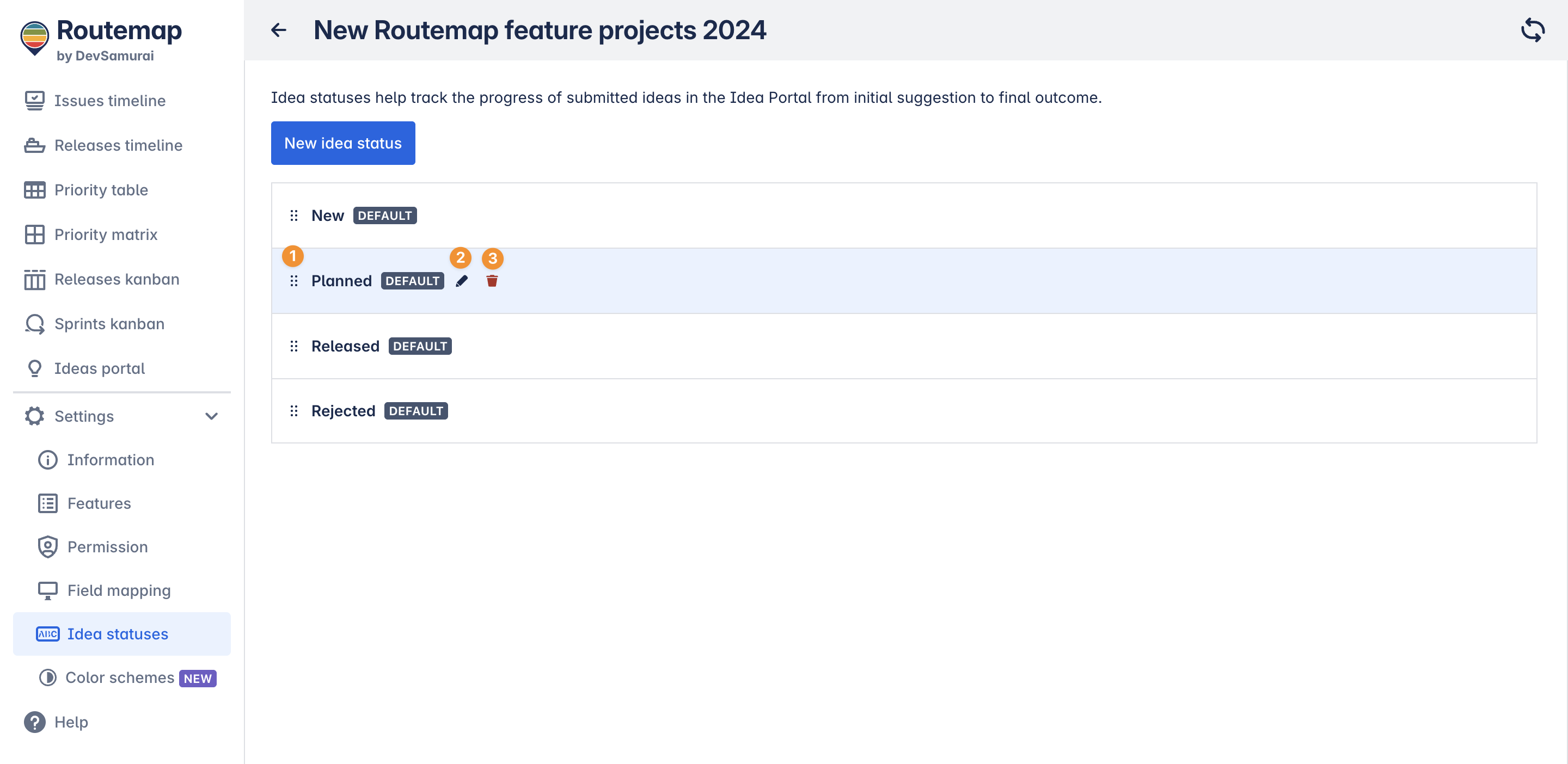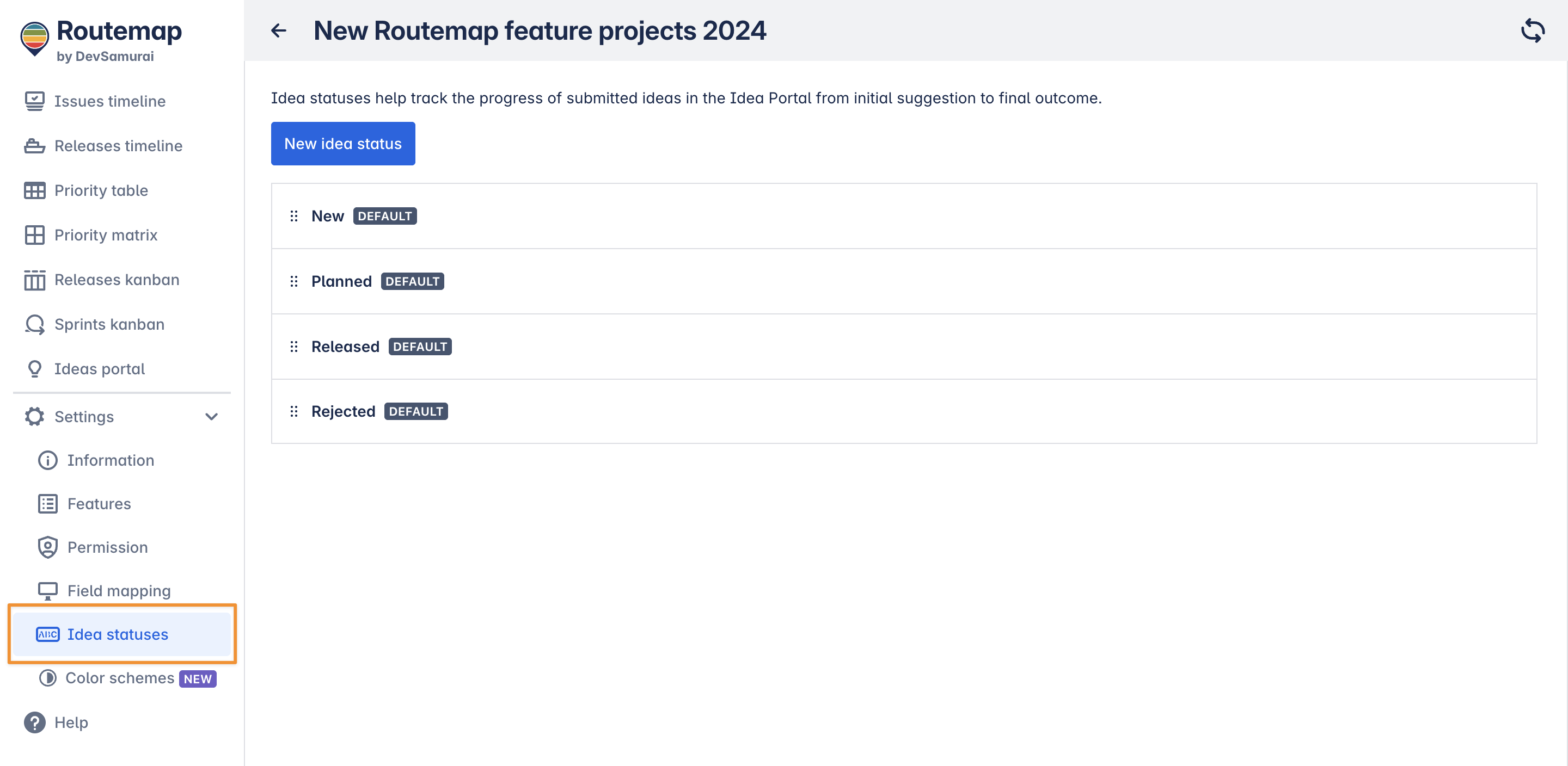 By default, the Ideas portal contains 4 different statuses to help you manage your ideas, such as: