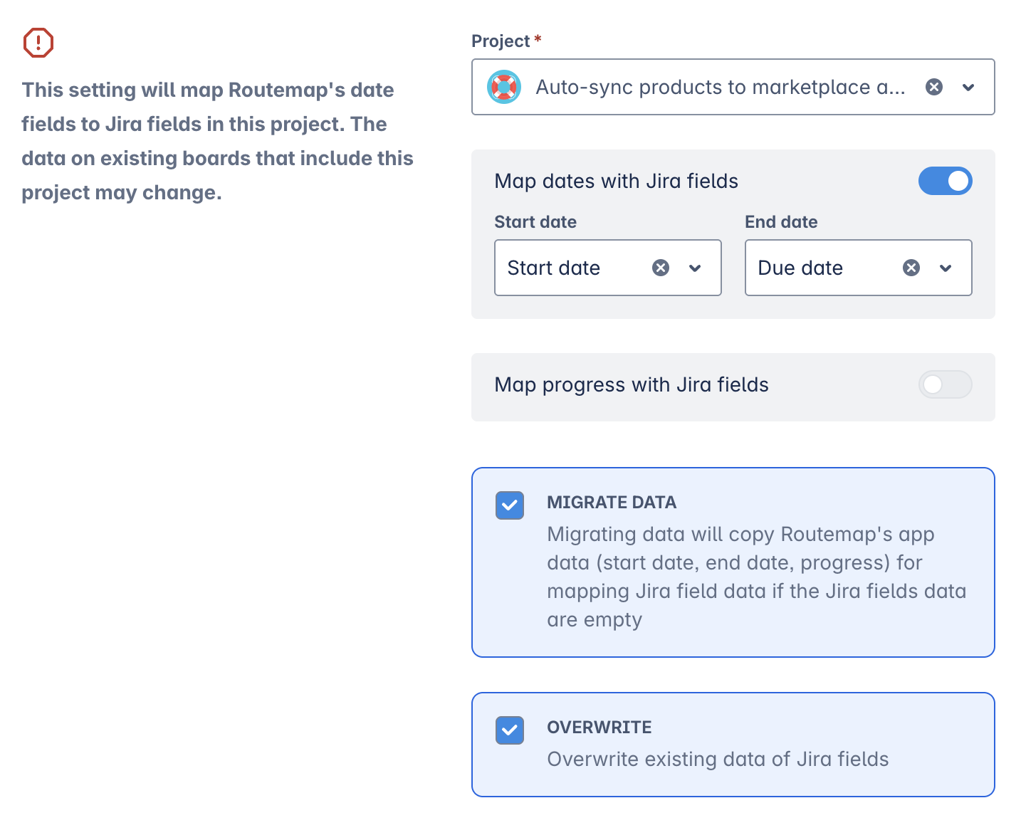Migrating data: if you decide to use this option, it will copy all the existing date values from Routemap to Jira fields accordingly.