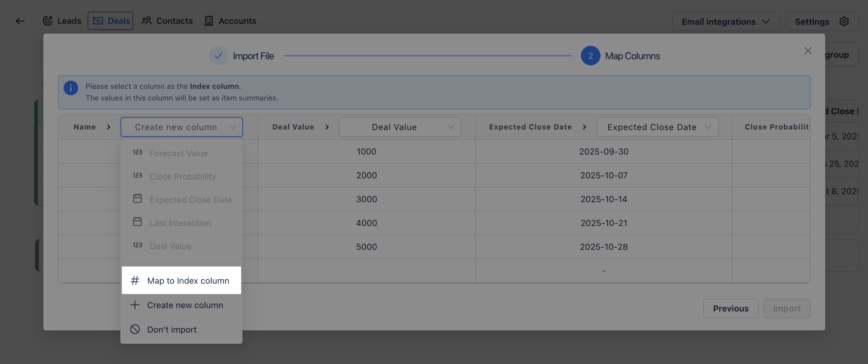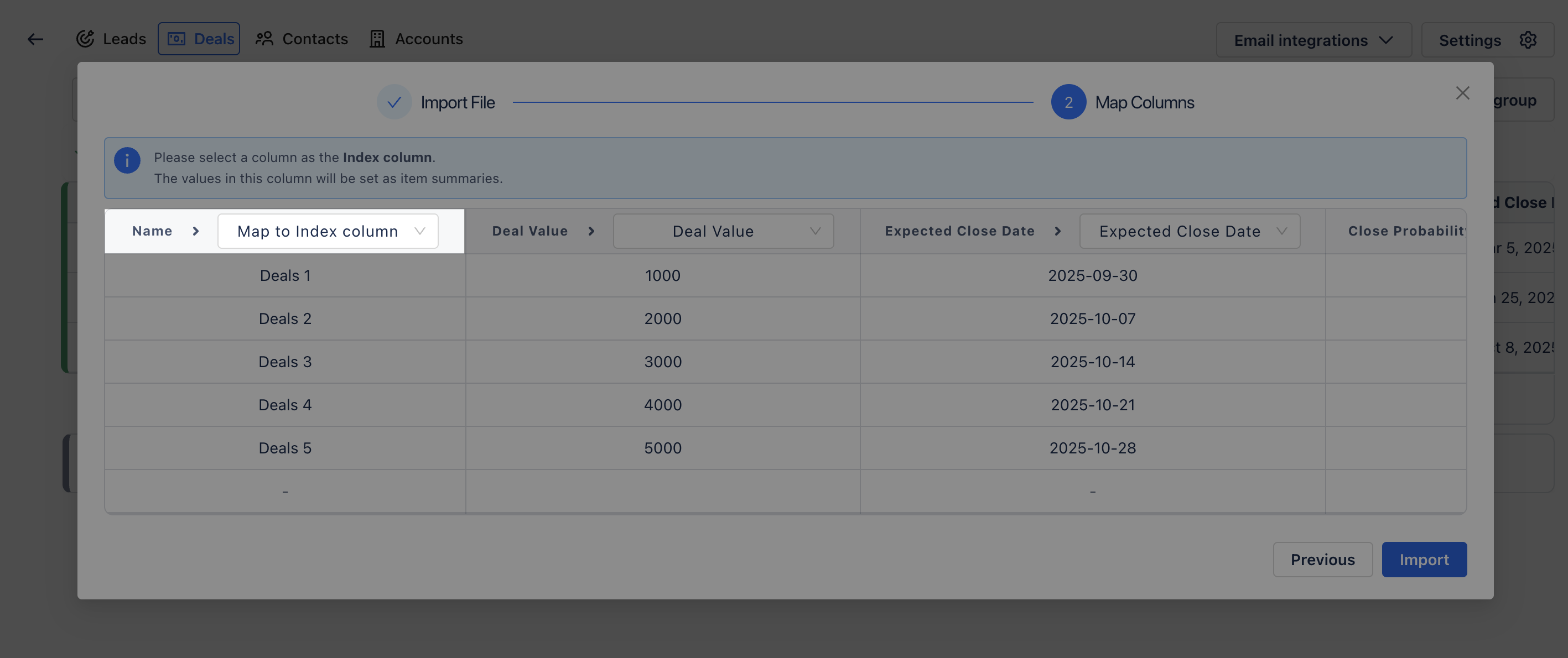For example, if your CSV file contains a column named Deal Name with entries like Deals 1, Deals 2, or Deals 3, mapping this column as the Index Column will make these names appear as the summary of each imported Deal.