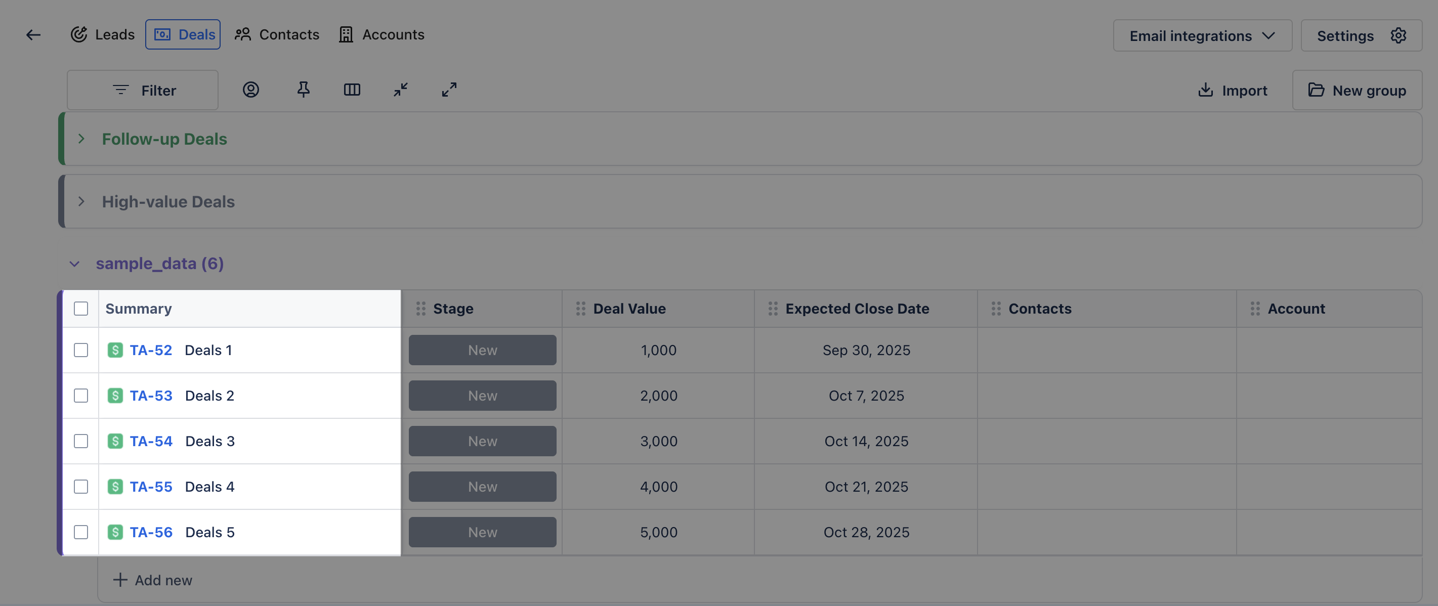 Click on ➕ Add New at the bottom of any group to create a new Deal.