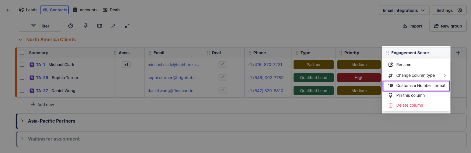 Number: Track numerical data (e.g., Contact score, potential revenue).
