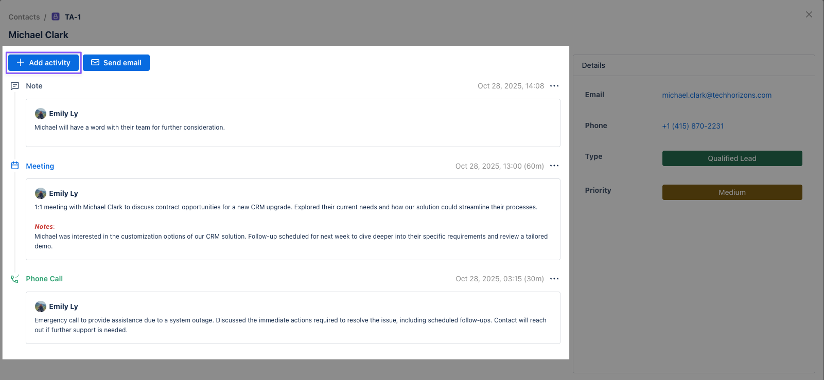 Activities record all interactions and updates related to a Contact. These can include notes, meetings, calls, or emails.
