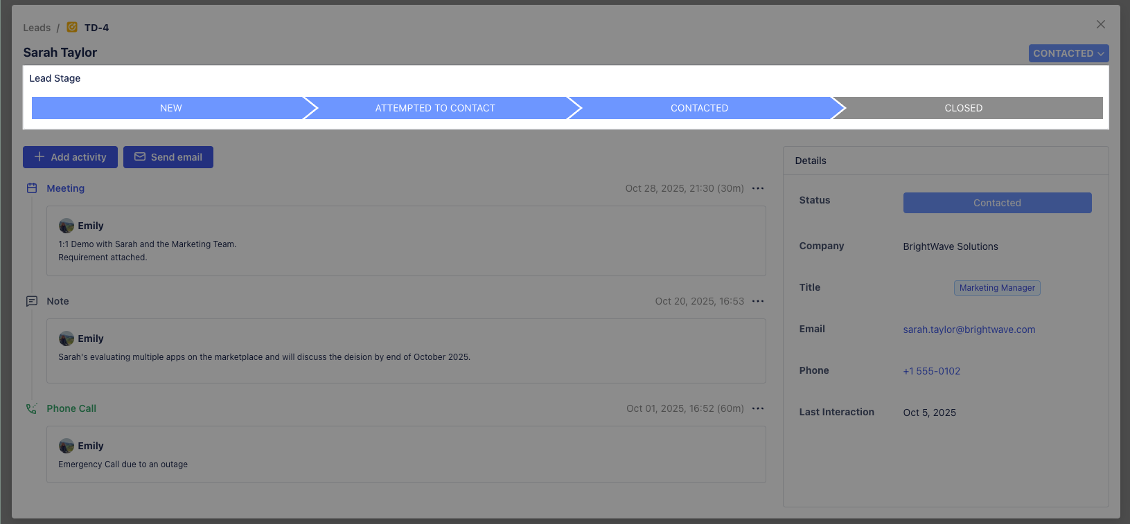 At the top of the Lead page, you’ll find the Lead Stage panel. This shows the Lead’s progress through your sales workflow.