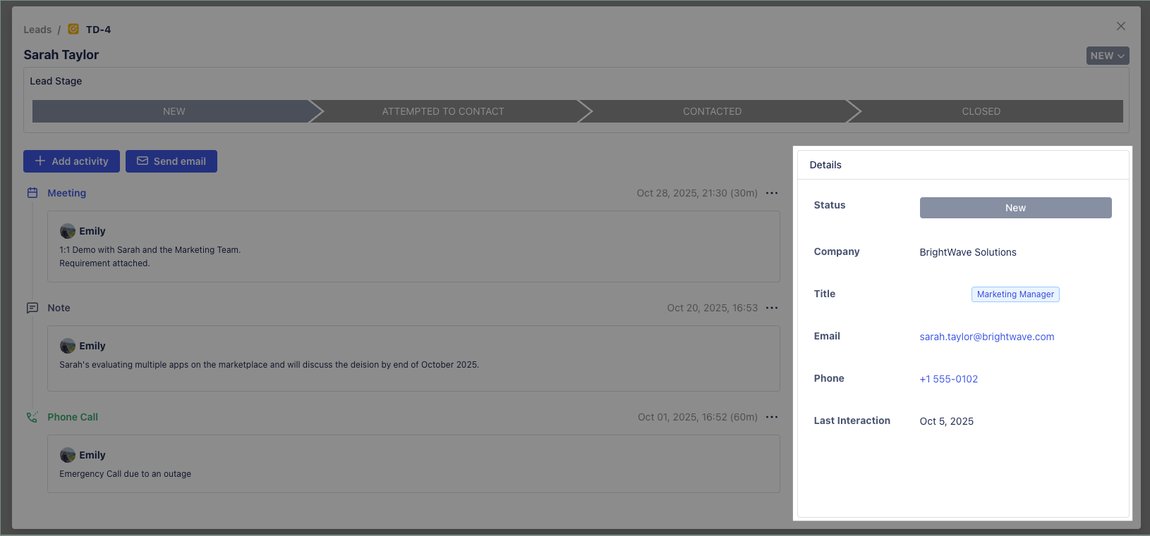 The panel on the right-hand side displays all key information about the Lead. This information is pulled from the columns in the Lead board. If you hide or show columns in the board view, those changes will be reflected here in the Lead details.