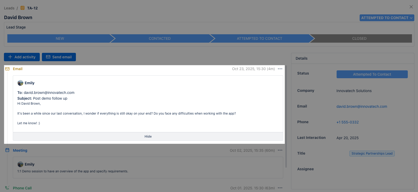 – Emails sent via SalesForge will appear here if Visibility is enabled, allowing your team to track communication history.