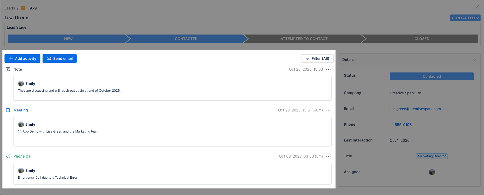 All activities are displayed chronologically, creating a clear timeline of client engagement.