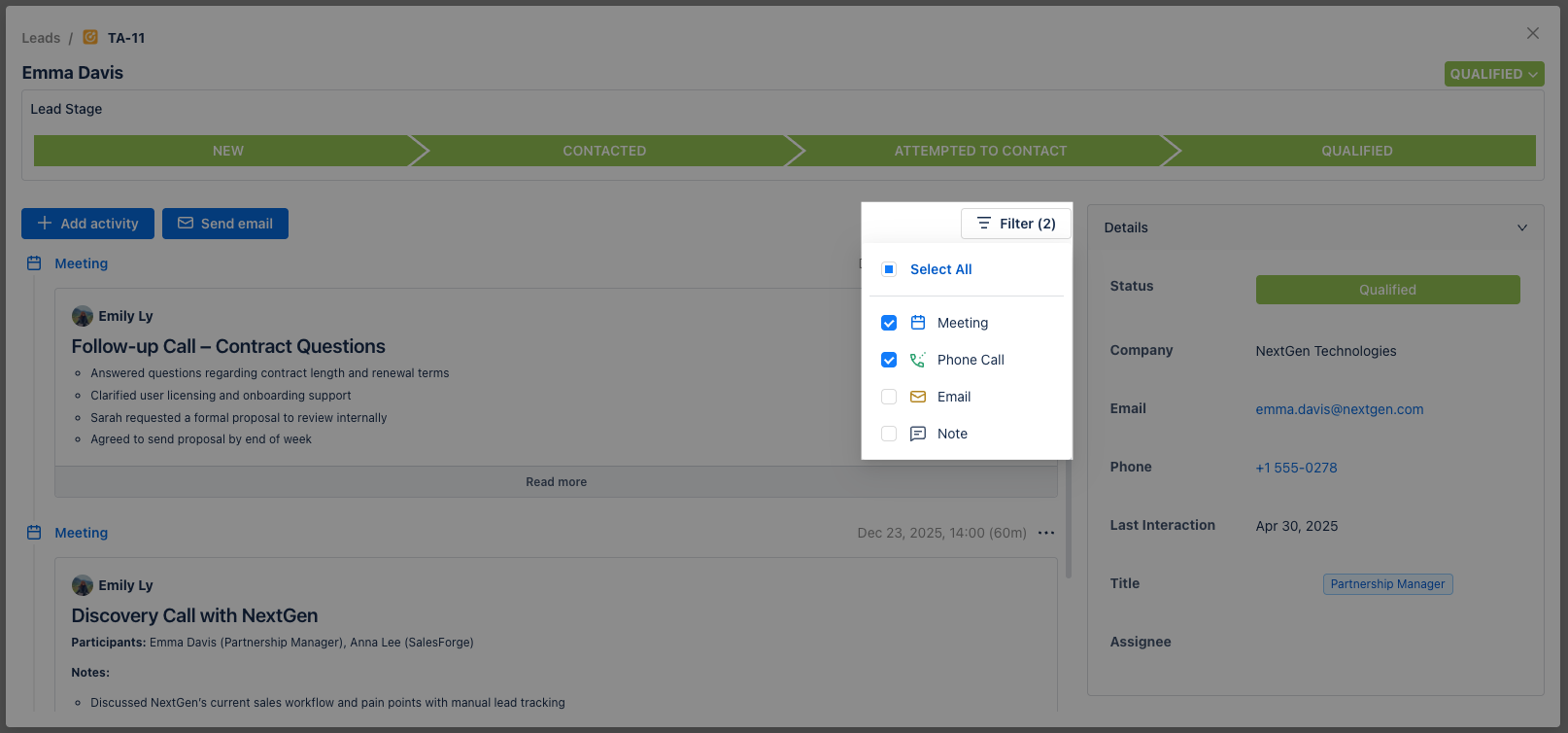 .Select one or more activity types you want to view (Meeting, Phone Call, Email, Note).