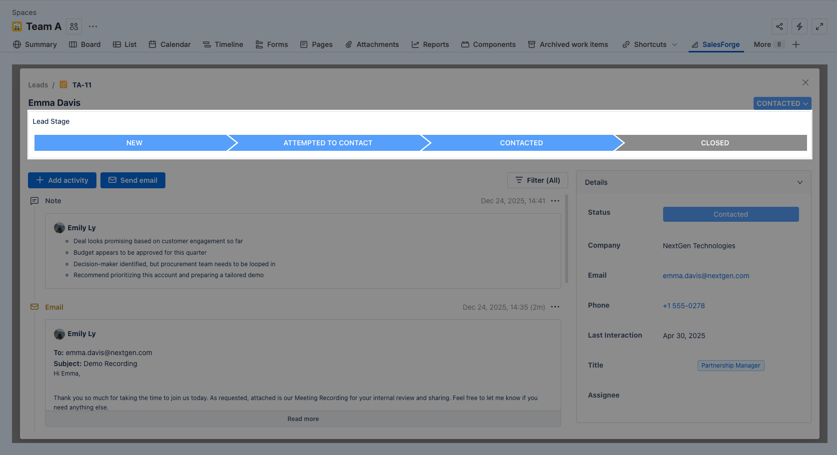 When you open a Lead, you are working with it as a :SalesForge_Lead: SalesForge Lead work item in Jira. This view allows you to track all relevant details, communications, and activities related to a specific Lead.