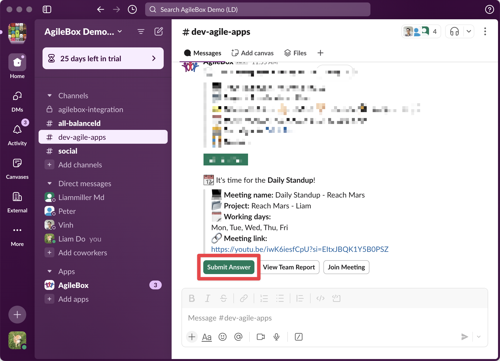 Click the Submit answer button to be redirected to the active daily standup submission form in Jira