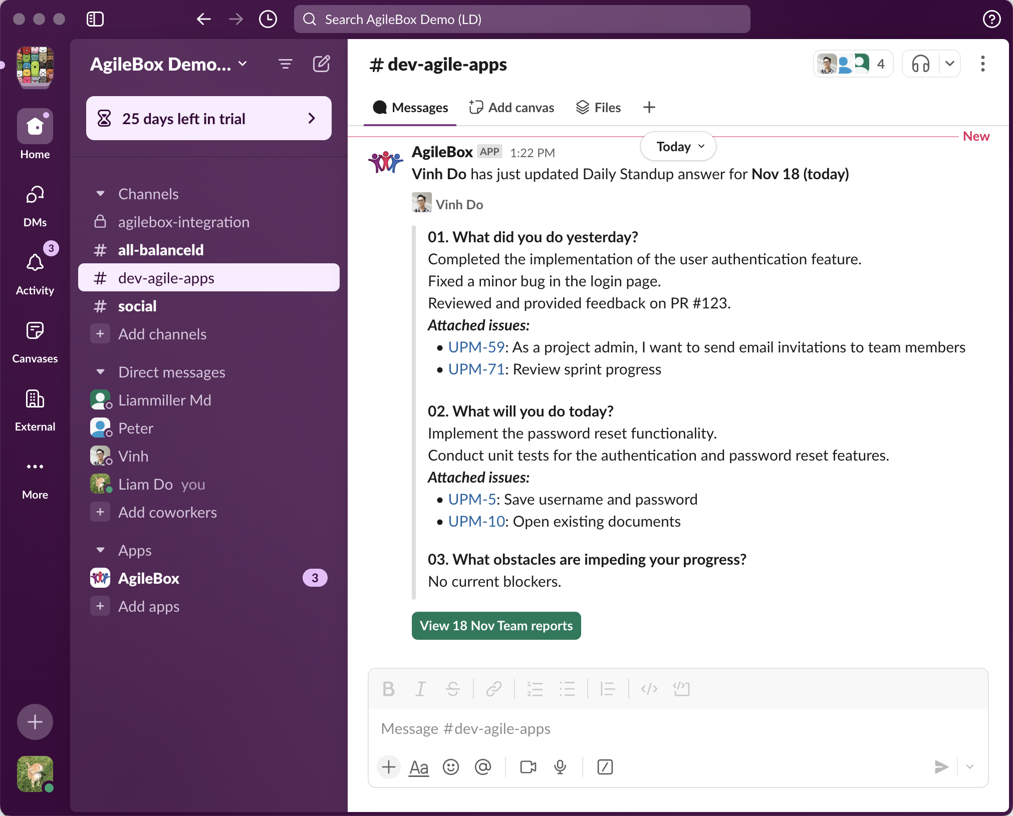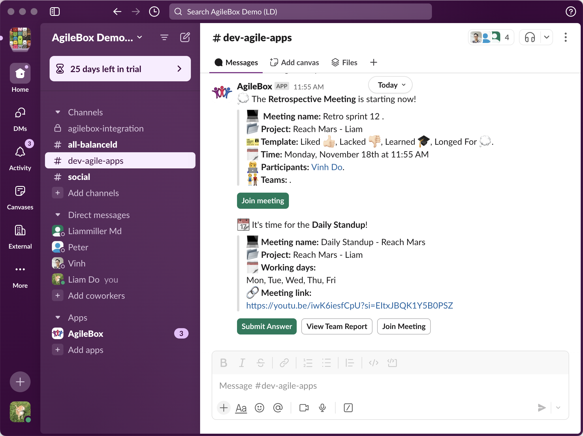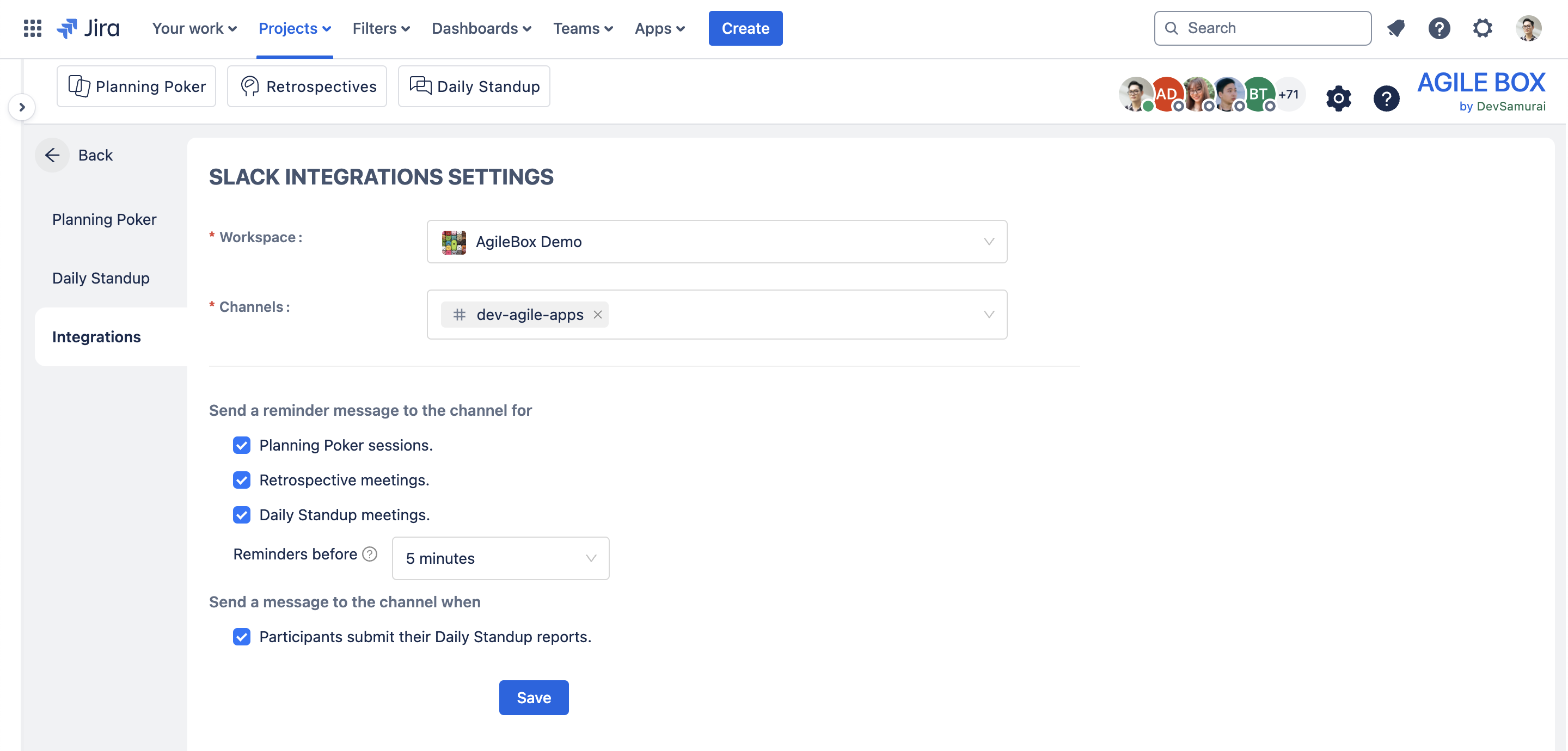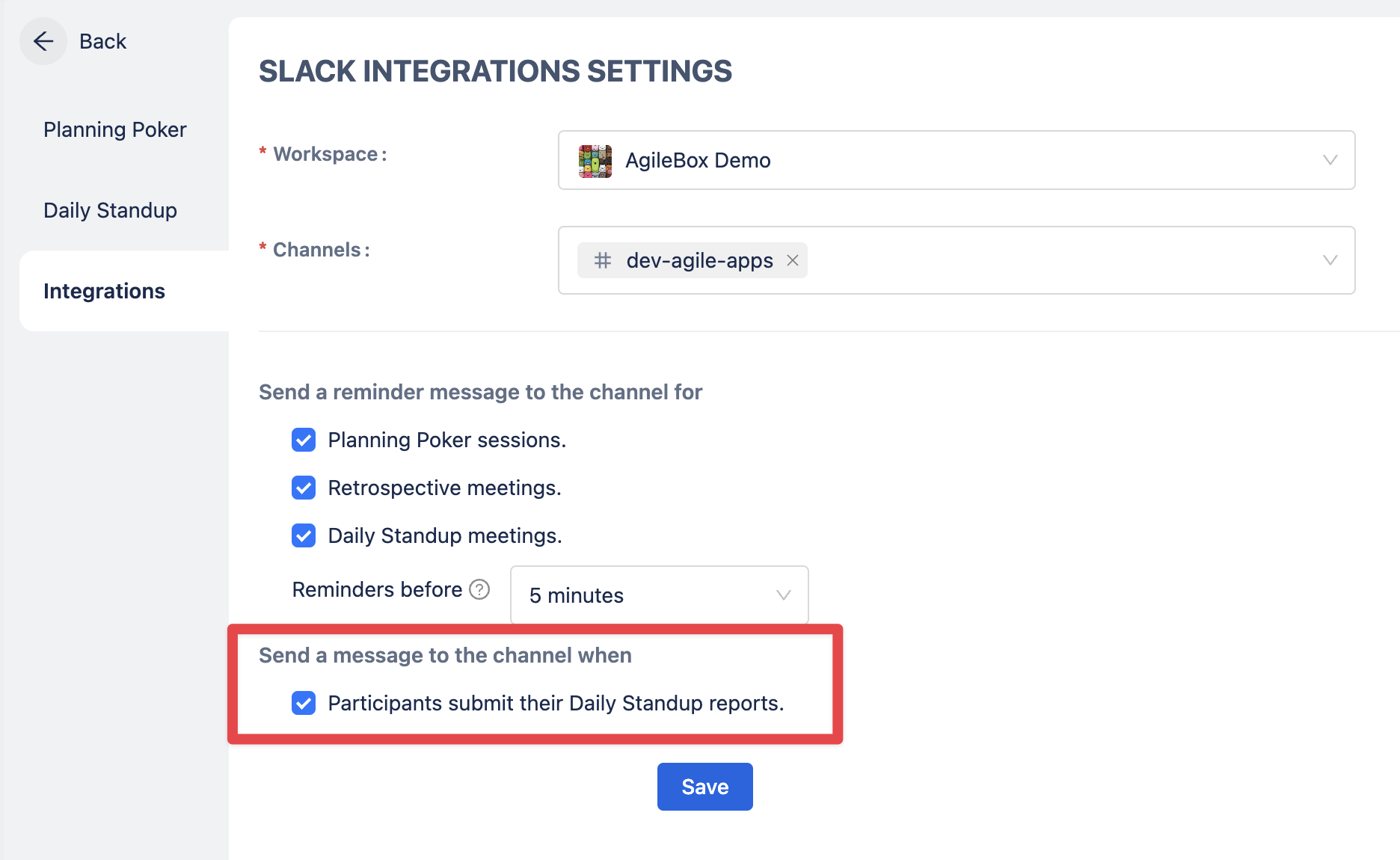 Receive automated notifications for all scheduled Agile activities in your Slack workspace and channels.