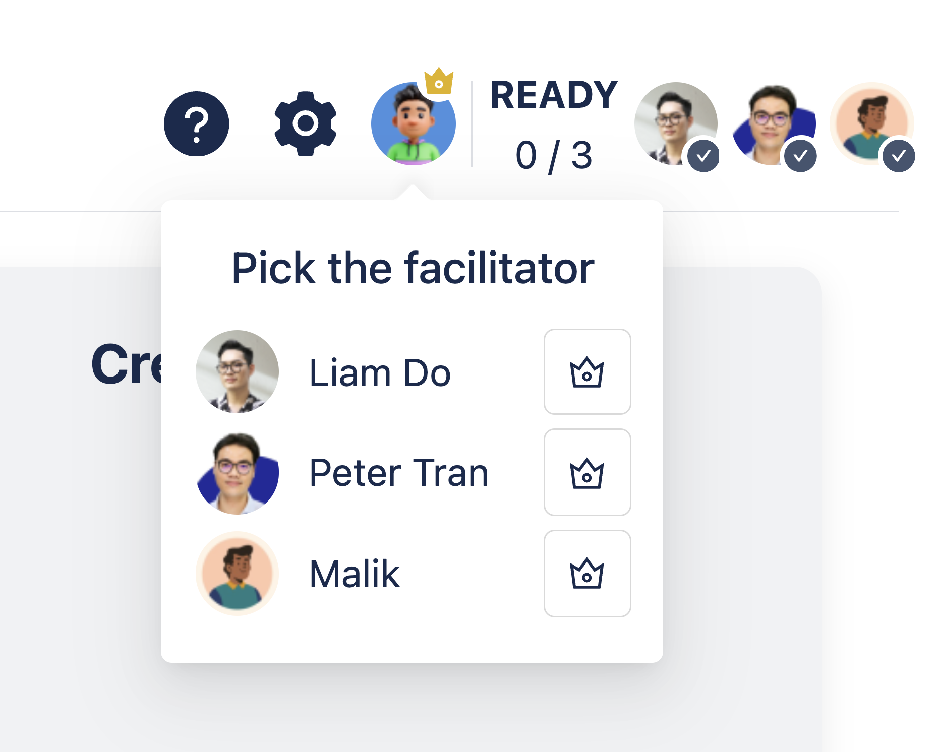 With the Dynamic type, the current facilitator can transfer their role during the meeting by clicking their avatar (marked with a crown) and selecting a new facilitator from the list.