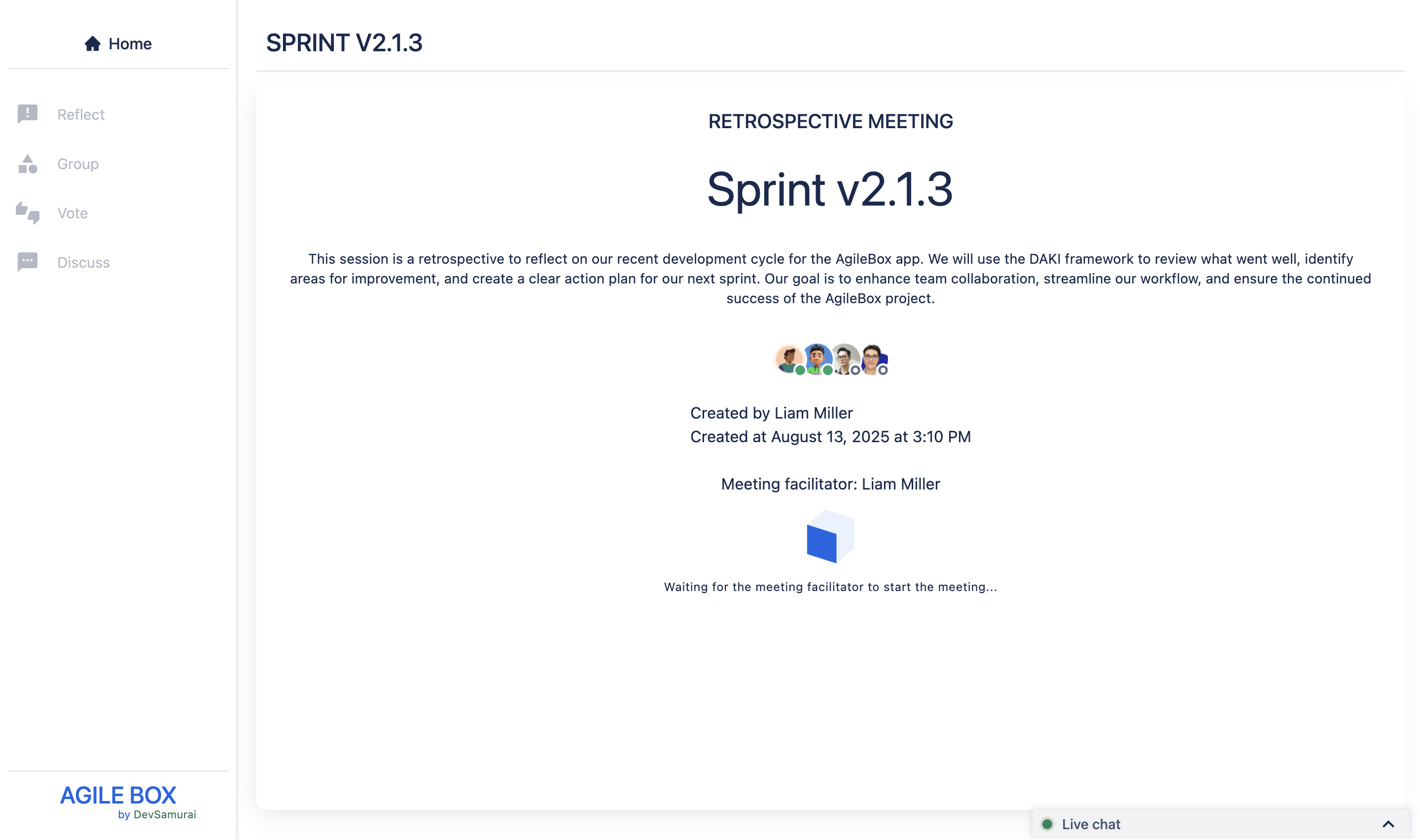 Only the facilitator can start the meeting. Once started, all participants move through 4 stages of the retrospective session together.