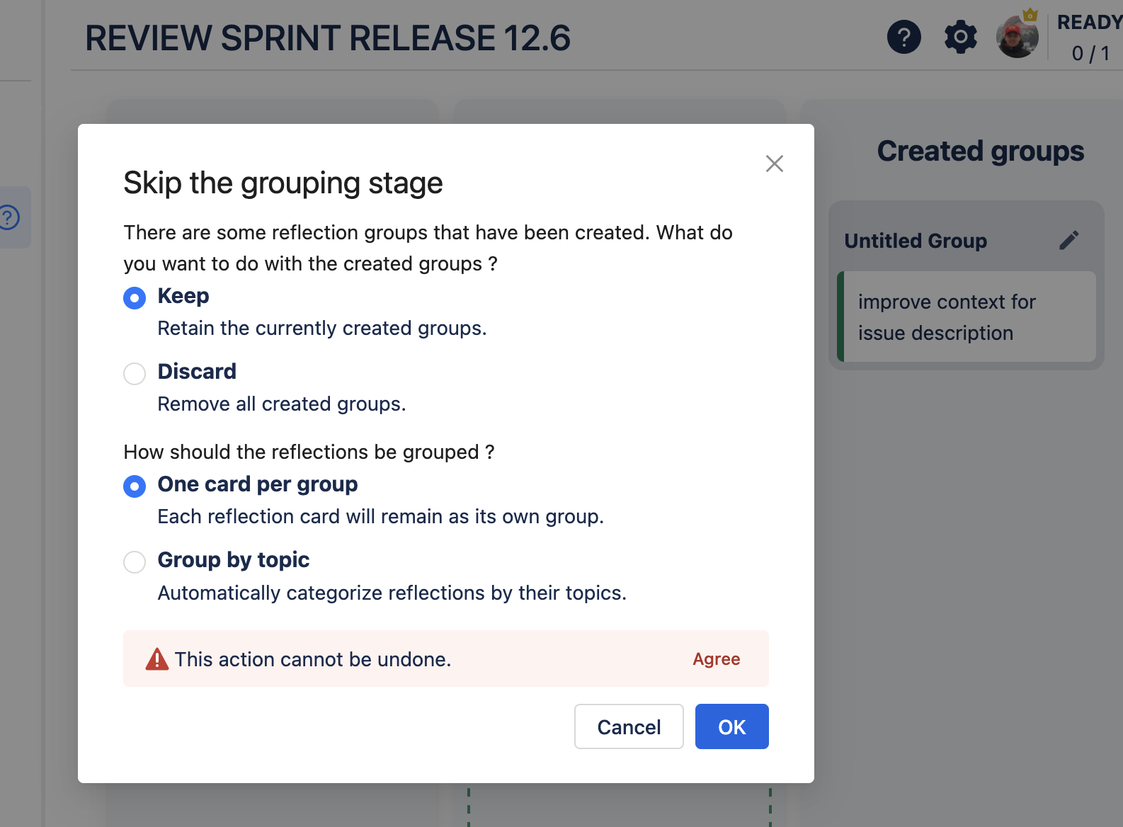 • Keep: retain the currently created groups.