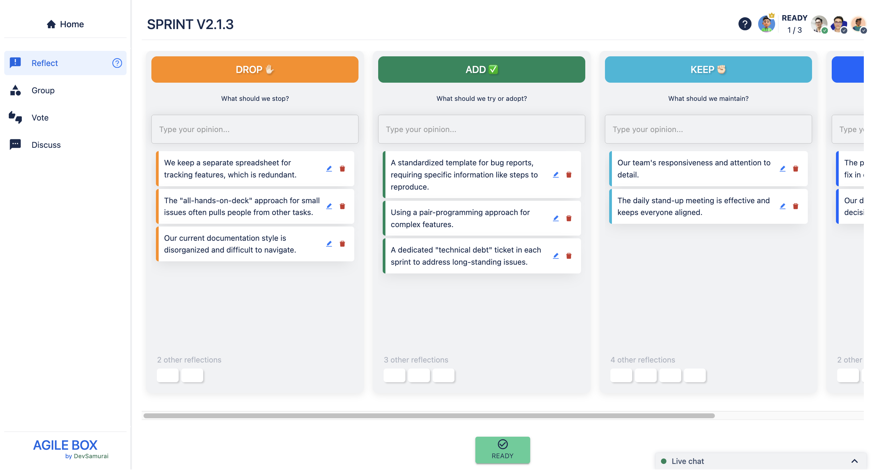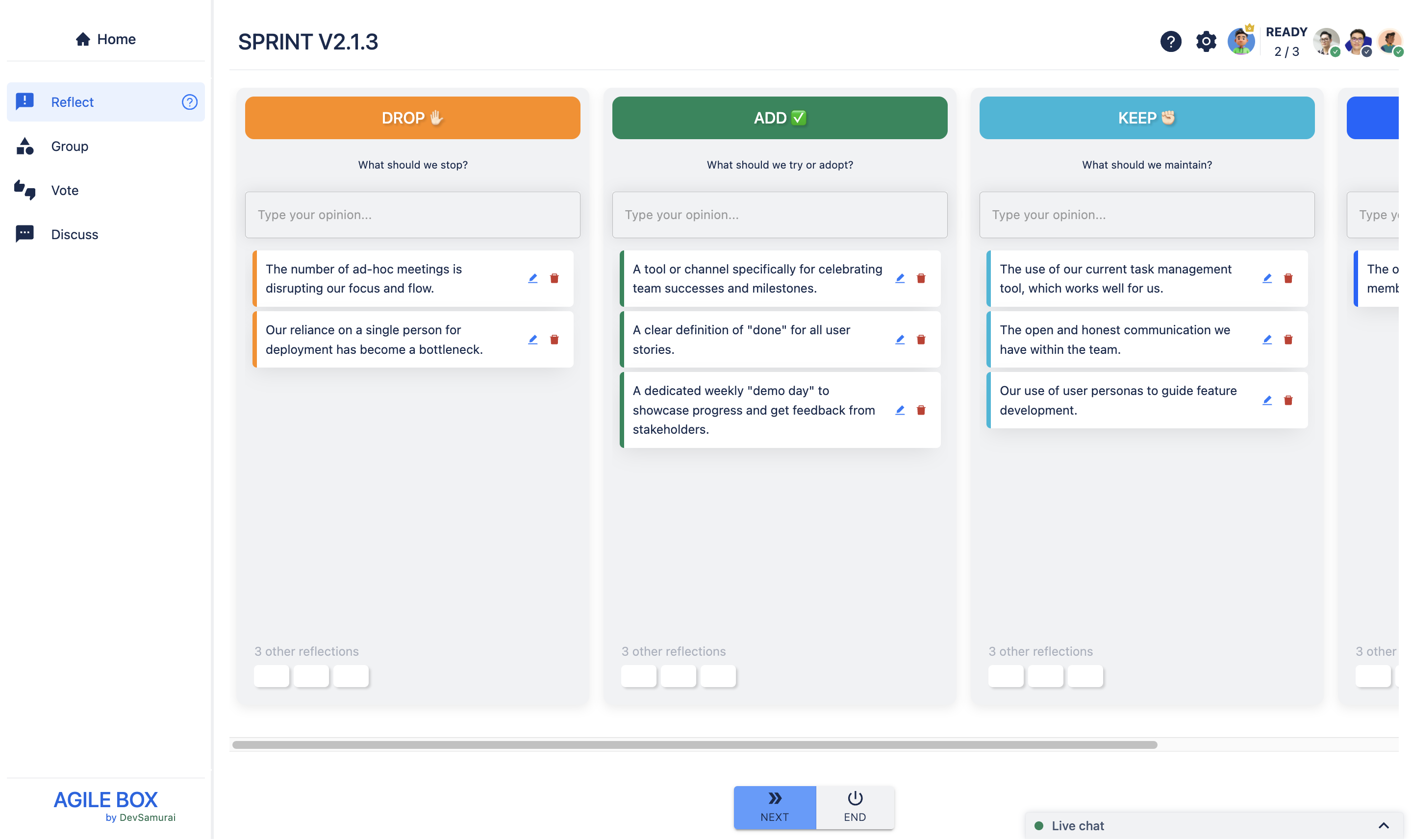 All participants type their reflections in the relevant columns. You can add as many reflection cards as you like and edit or delete your own reflections anytime during this stage.