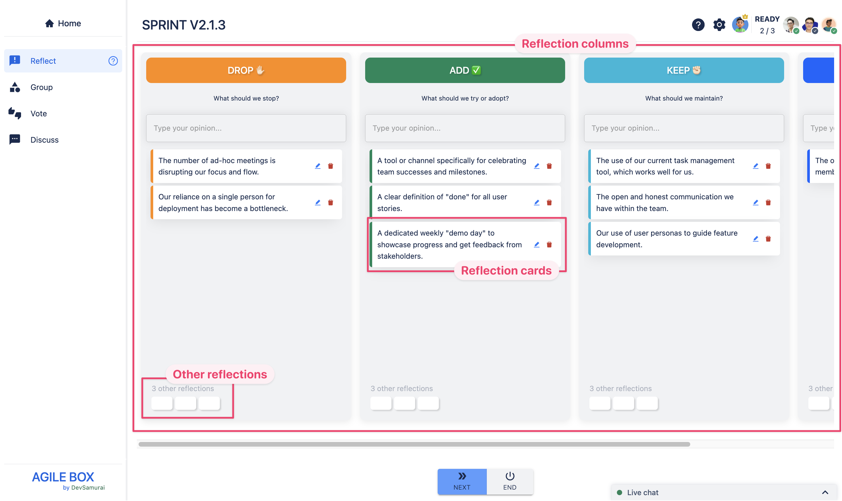 The columns displayed during the Reflect stage are based on the retrospective template chosen when creating the meeting. Each column corresponds to a category or theme that guides the reflections.