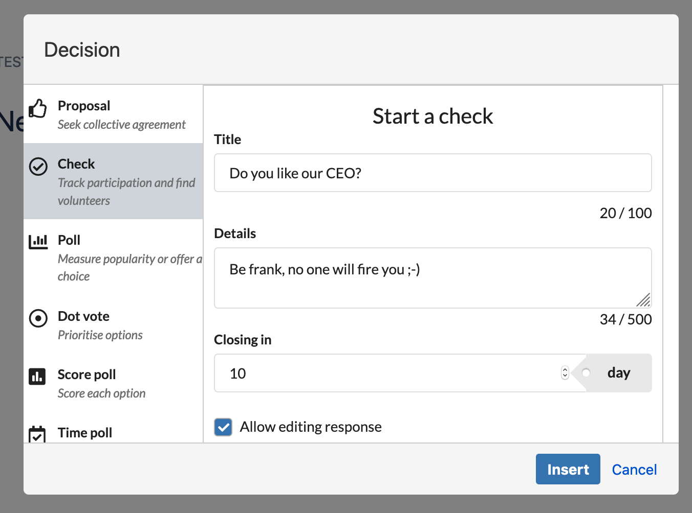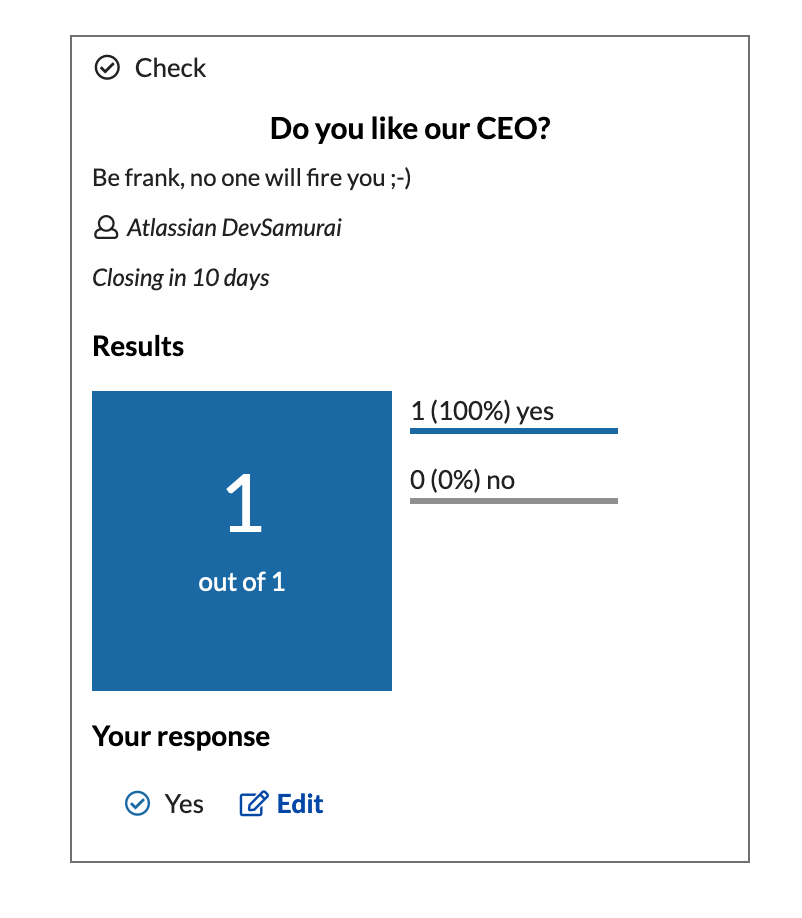 Allow editing response: If checked voters can edit their response as long as the Check is still active