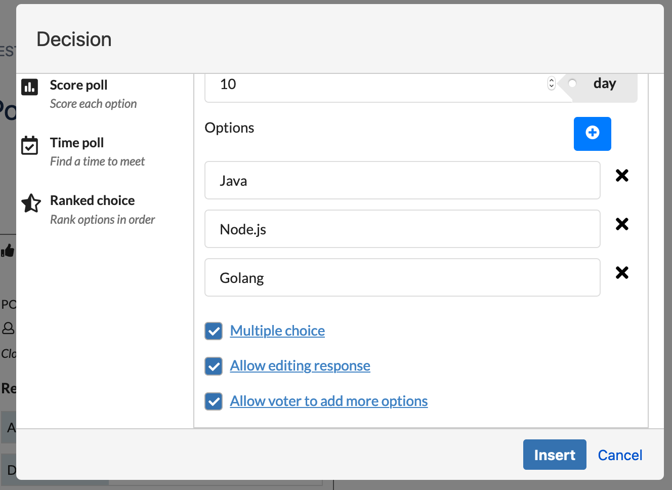 Use a poll to measure popularity or offer a choice. You can place some options and allow voters to choose from, voters can also add their options if it is allowed when creating poll.