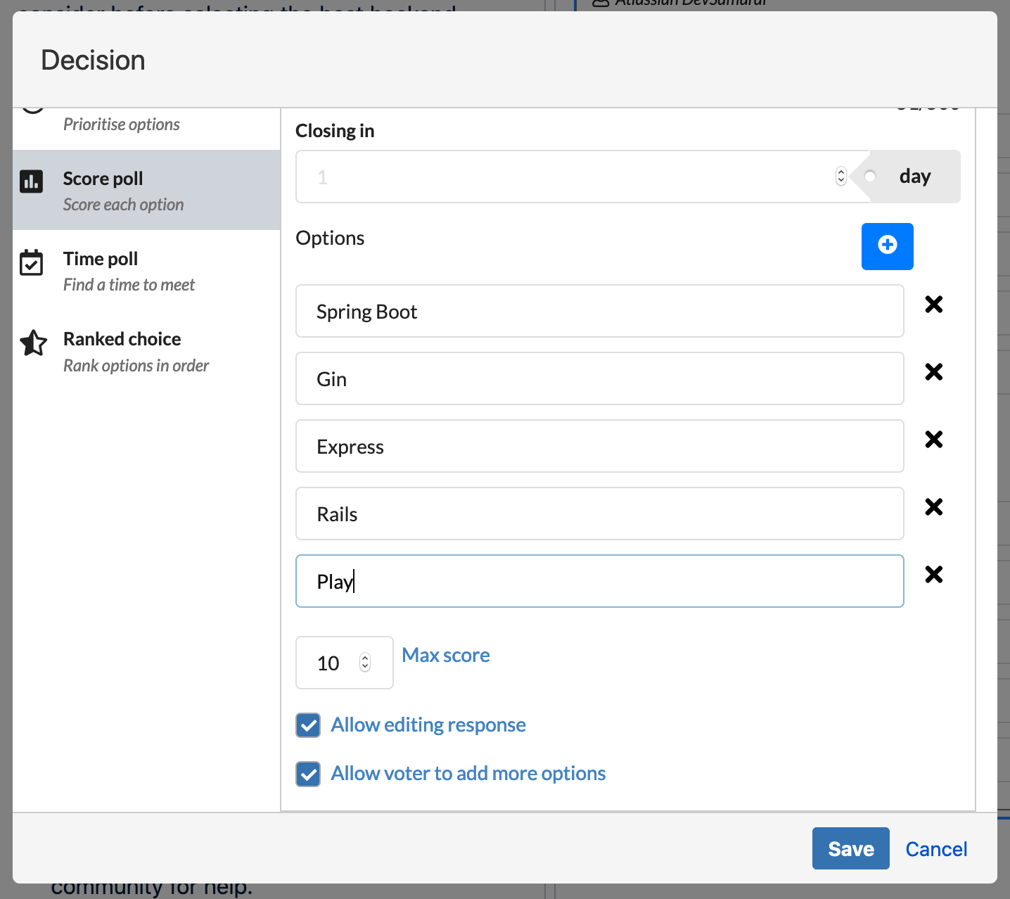 Details: short details of the poll, it will show up in the box but you can also create more content out side in the Confuence to support your idea