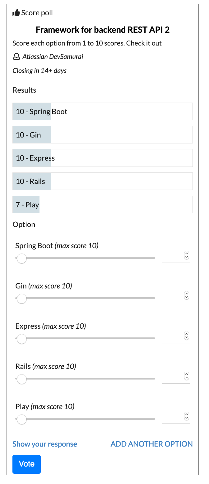 Slide score slider or input score for each option and vote. You can not vote above the maximum score