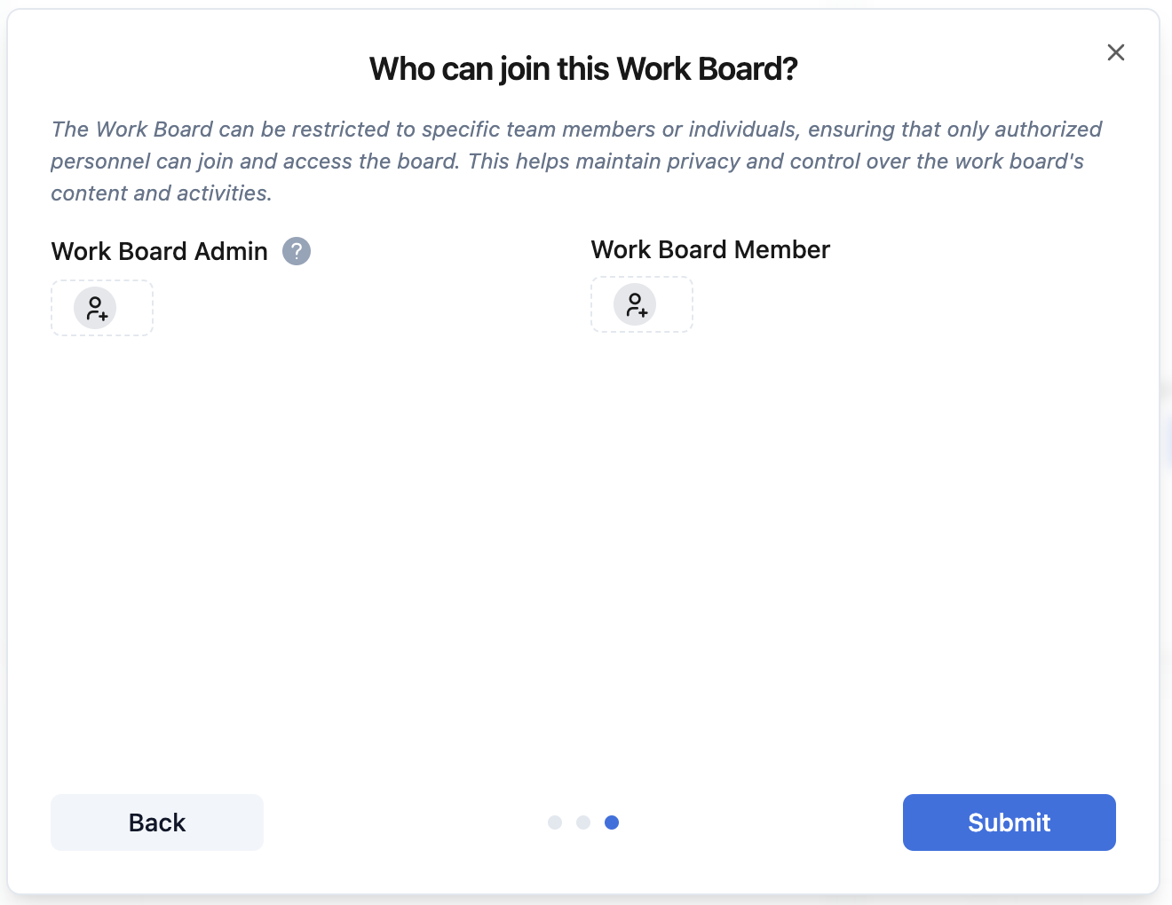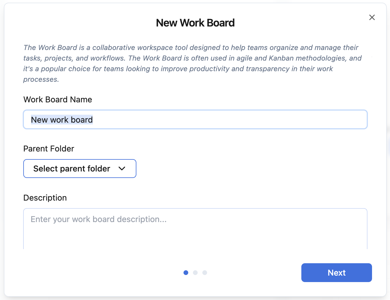 Enter a name for your board and optionally provide a description. Remember to select a folder you want to store your workboard. It will be in the root of the work zone in case you donβt select any parent folder.