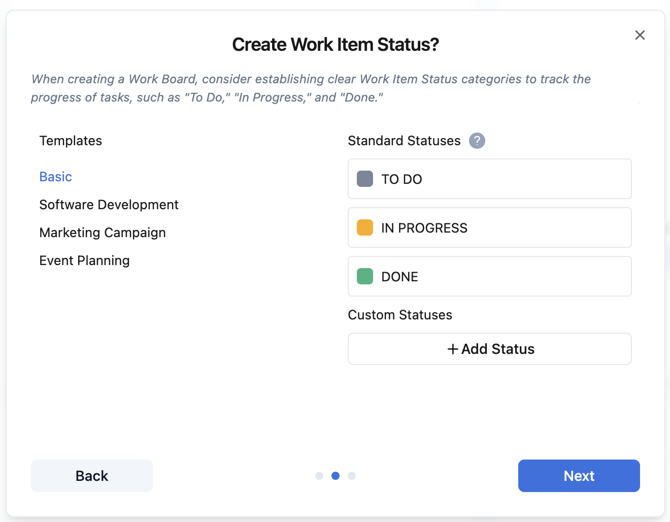 Select work item status: Choose the statuses that work items on this board can have, which helps in tracking progress.