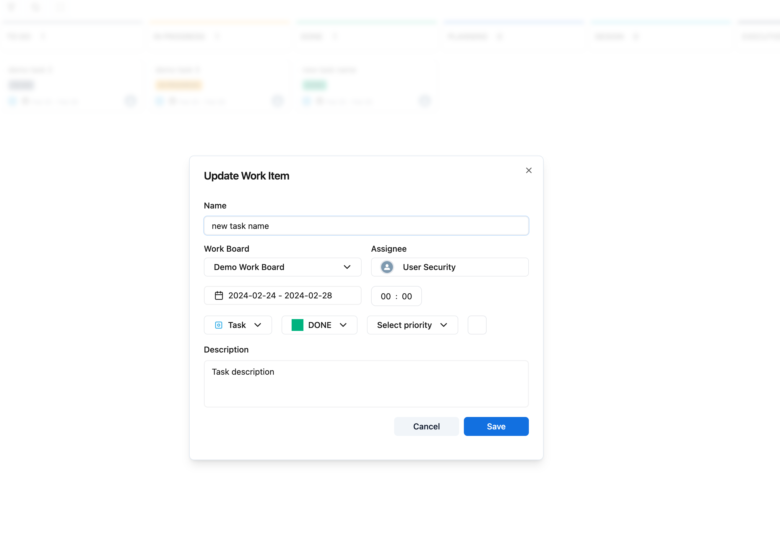 As easy as clicking on the task and then this “Update Work Item” modal pops up