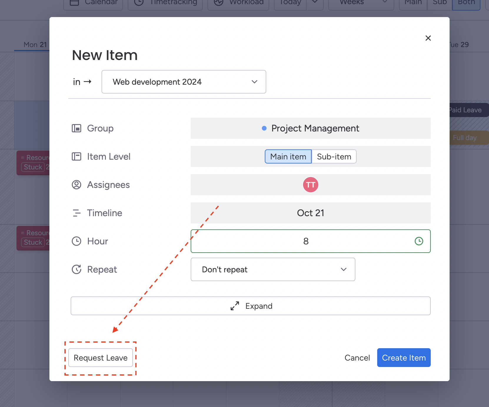 Submitting leave through the Schedule Board allows you to see how your planned days off align with scheduled tasks and other team activities, making it easier to avoid conflicts.