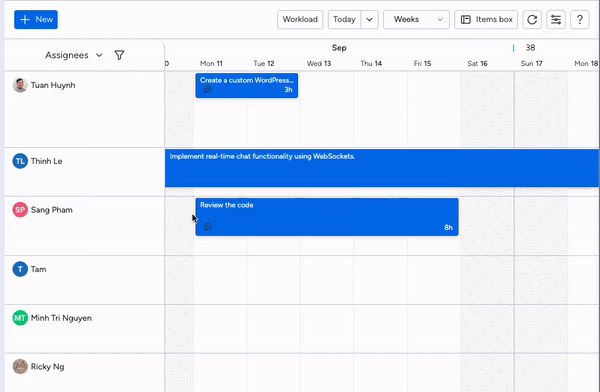 For a more convenient method, locate the assignee row and click on the desired time range to create a task on that timeline.