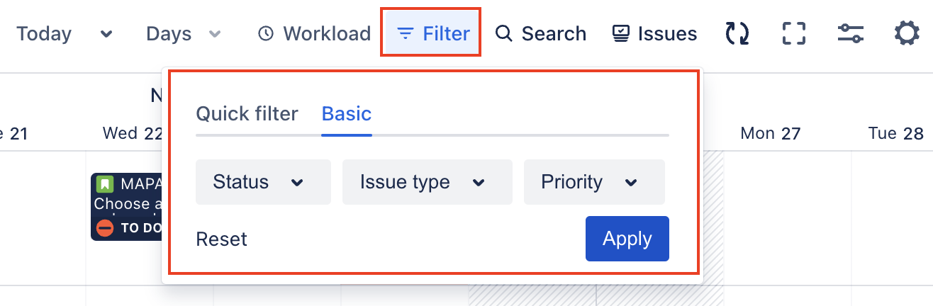 Basic filter by statuses, issue types, and priorities on the Schedule tab.