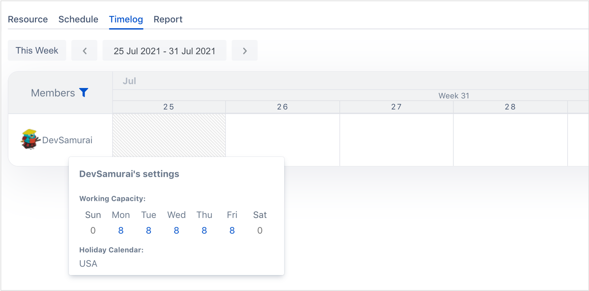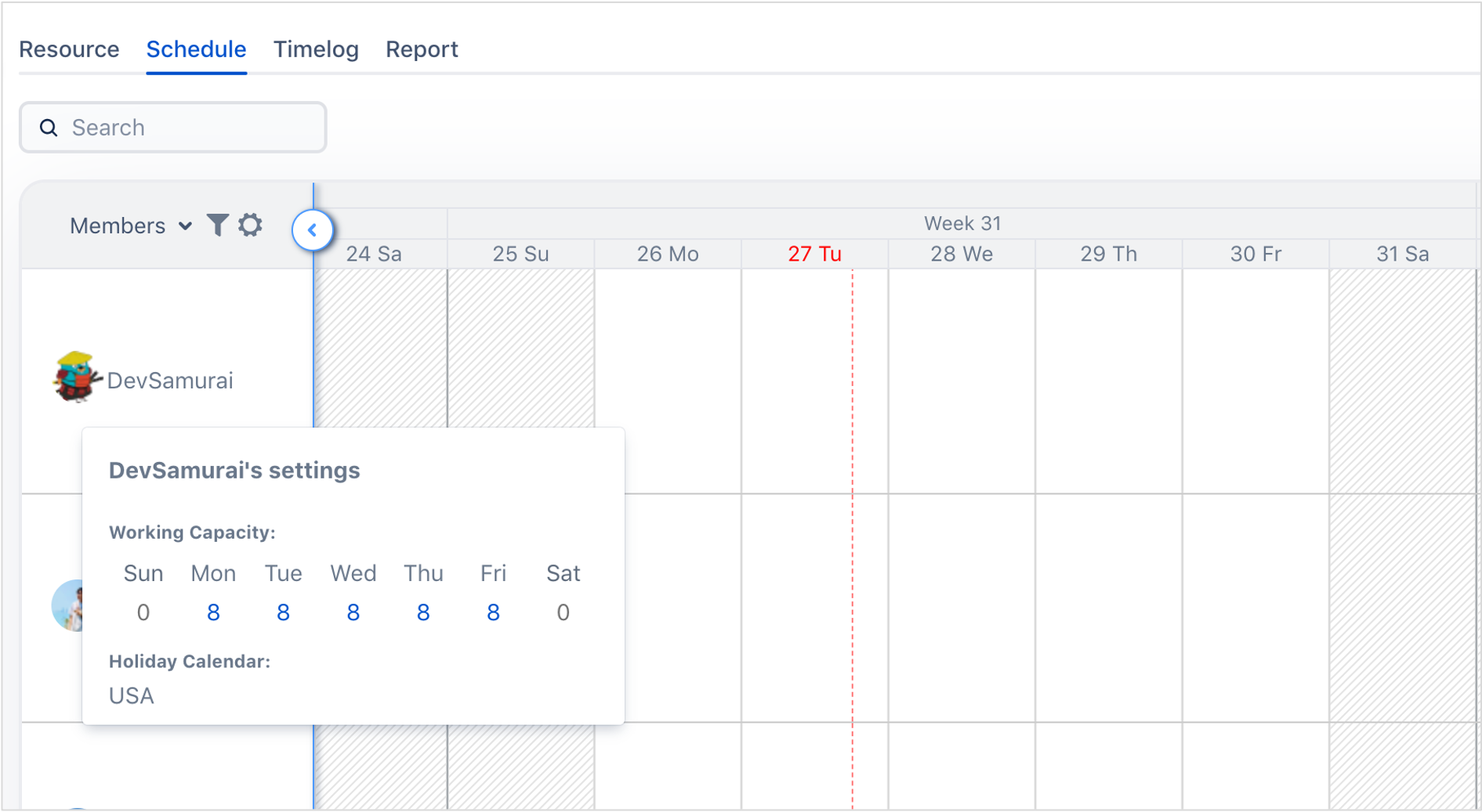 Show working capacity when clicking on member avatar in schedule board and Timelog.
