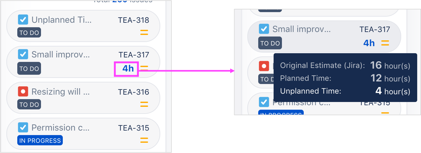 For estimated issues, the unplanned time will be calculated base on original estimate and planned time, and show on the issue card. Hover the mouse over the number of hours to see the details.