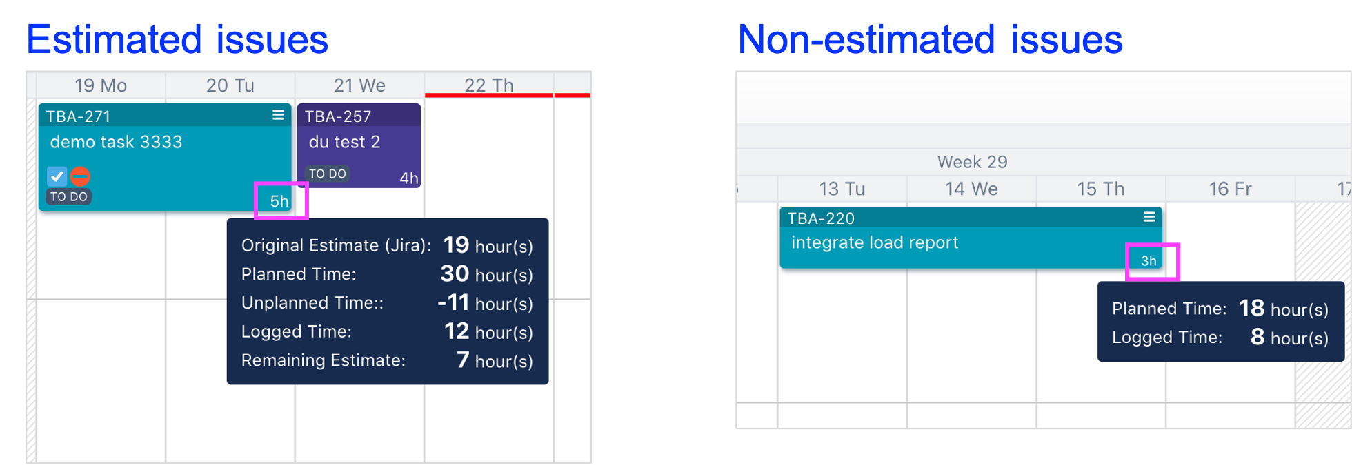 For estimated issues, the unplanned time will be calculated base on original estimate and planned time, and show on the issue card. Hover the mouse over the number of hours to see the details.