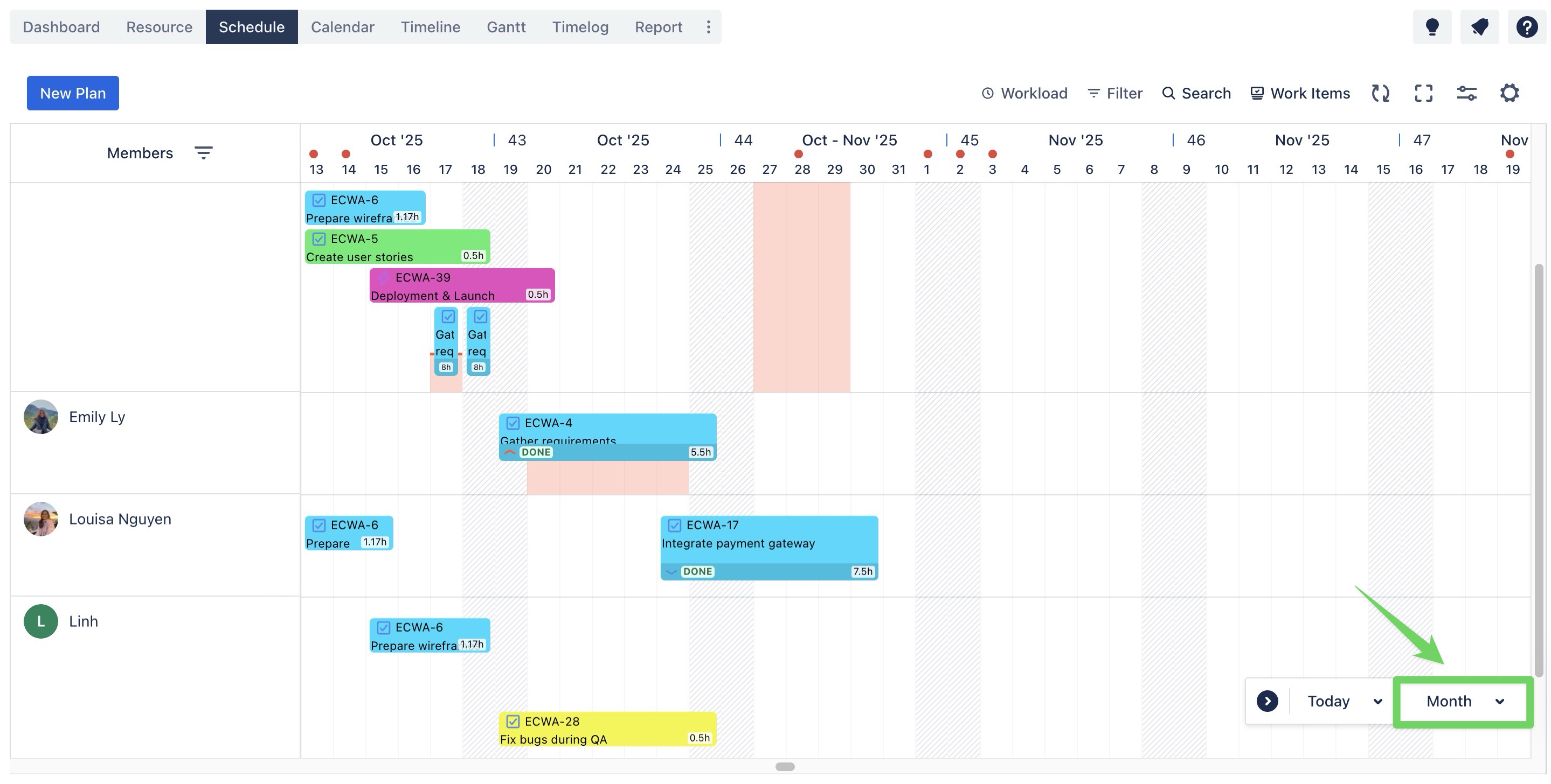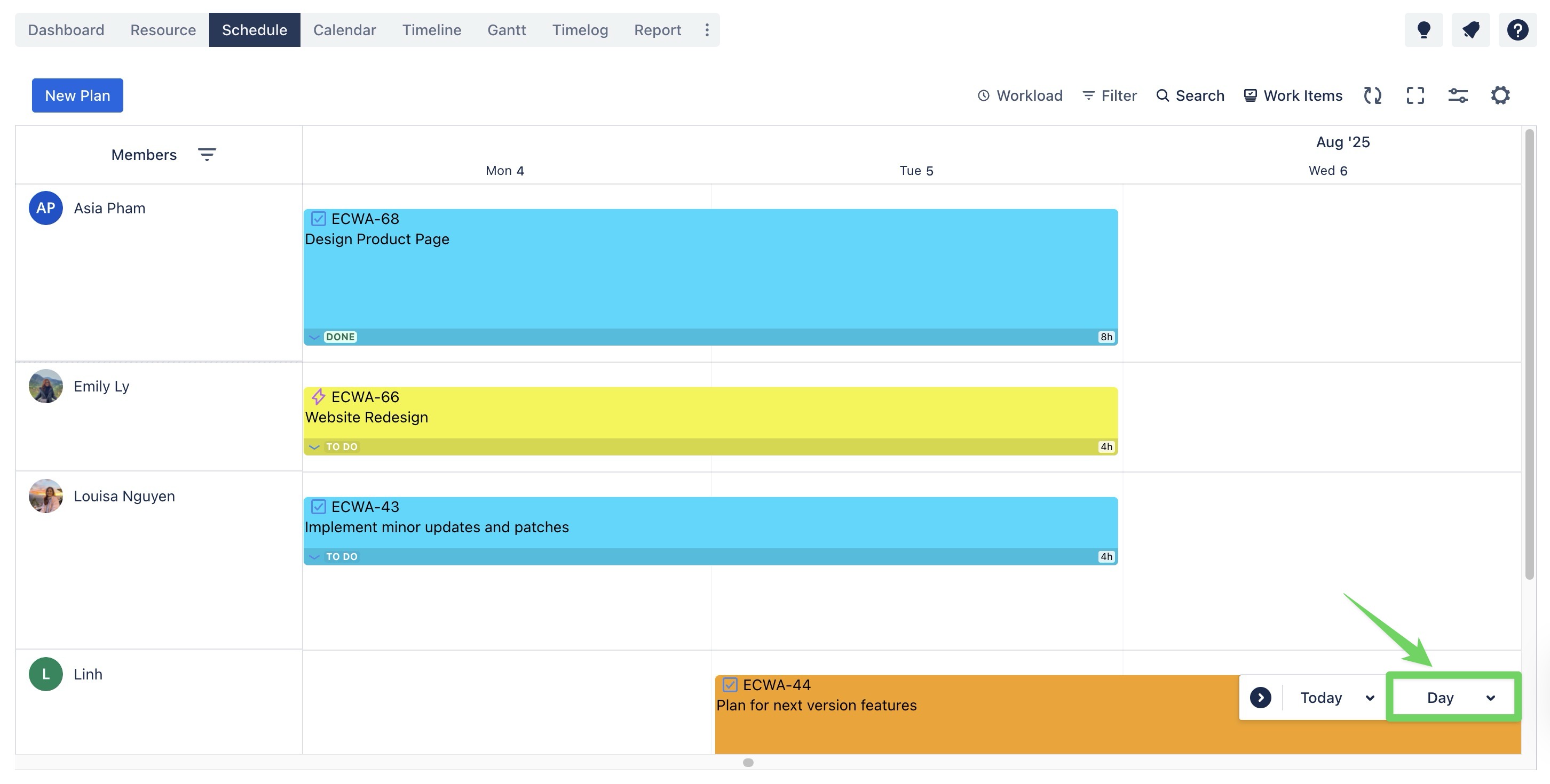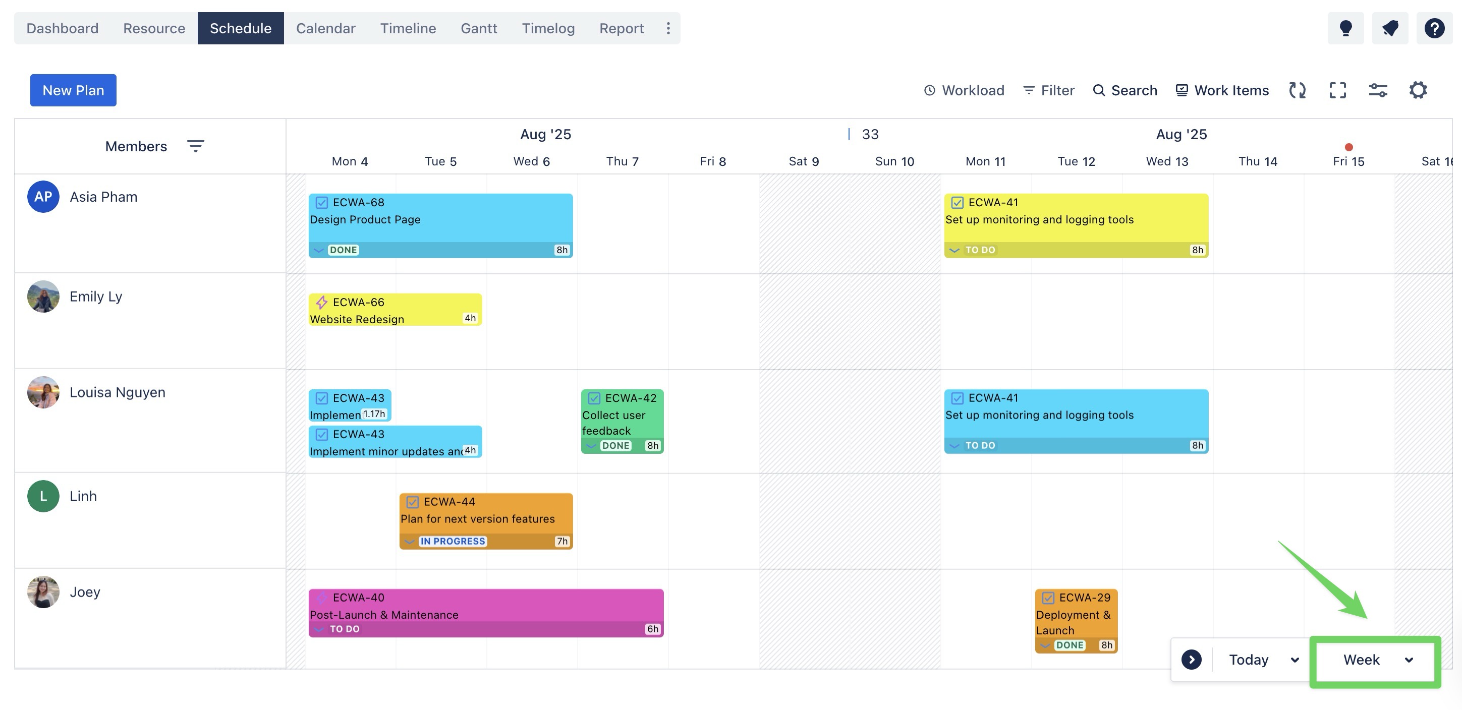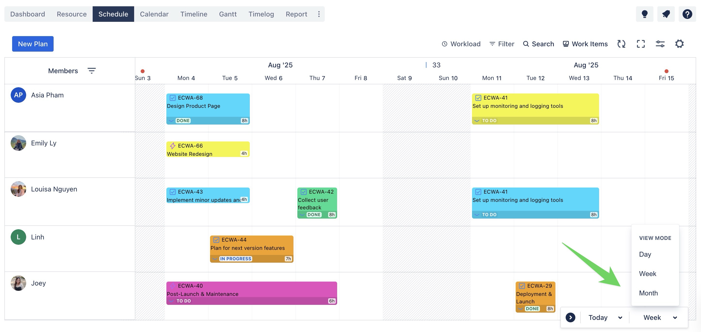 The Schedule & Calendar Boards provide three distinct view modes to fit different planning needs. To switch between them, use the timeframe selector located in the bottom corner of the board.