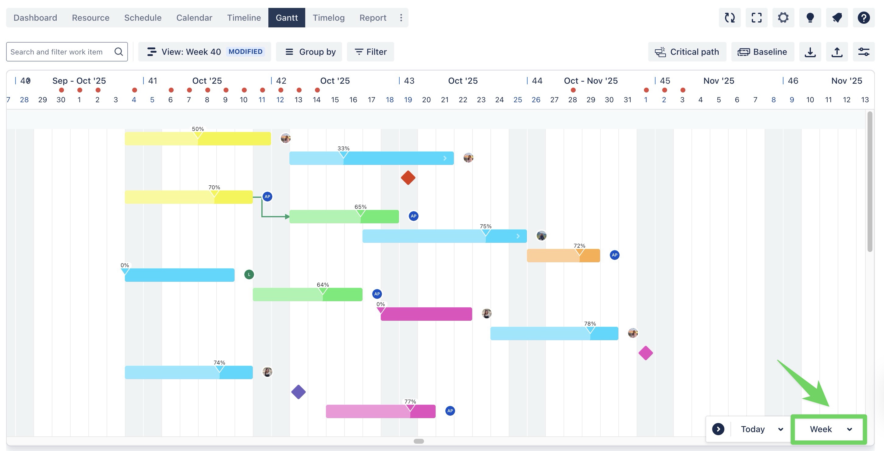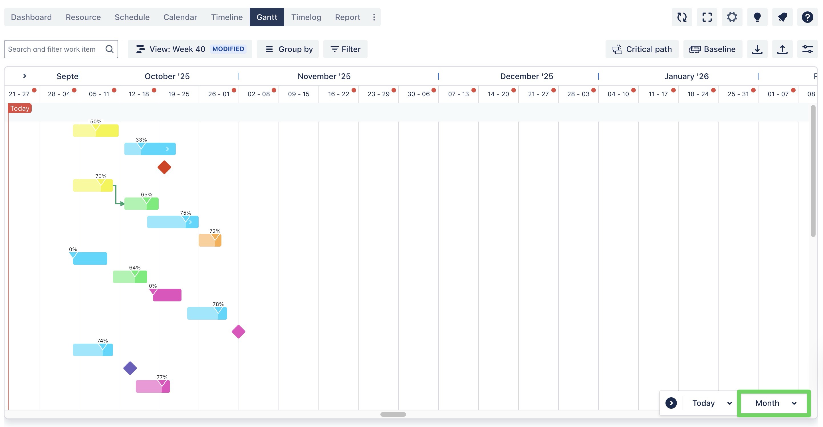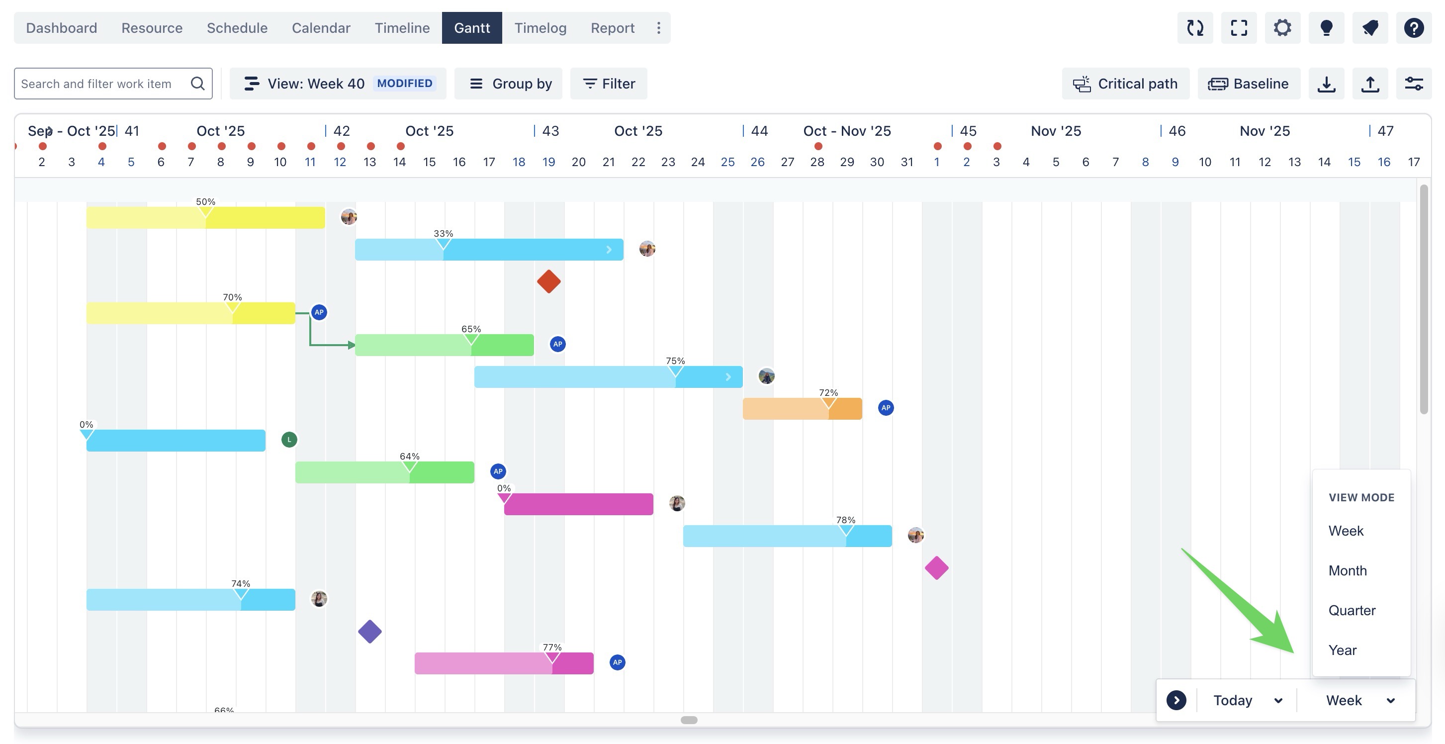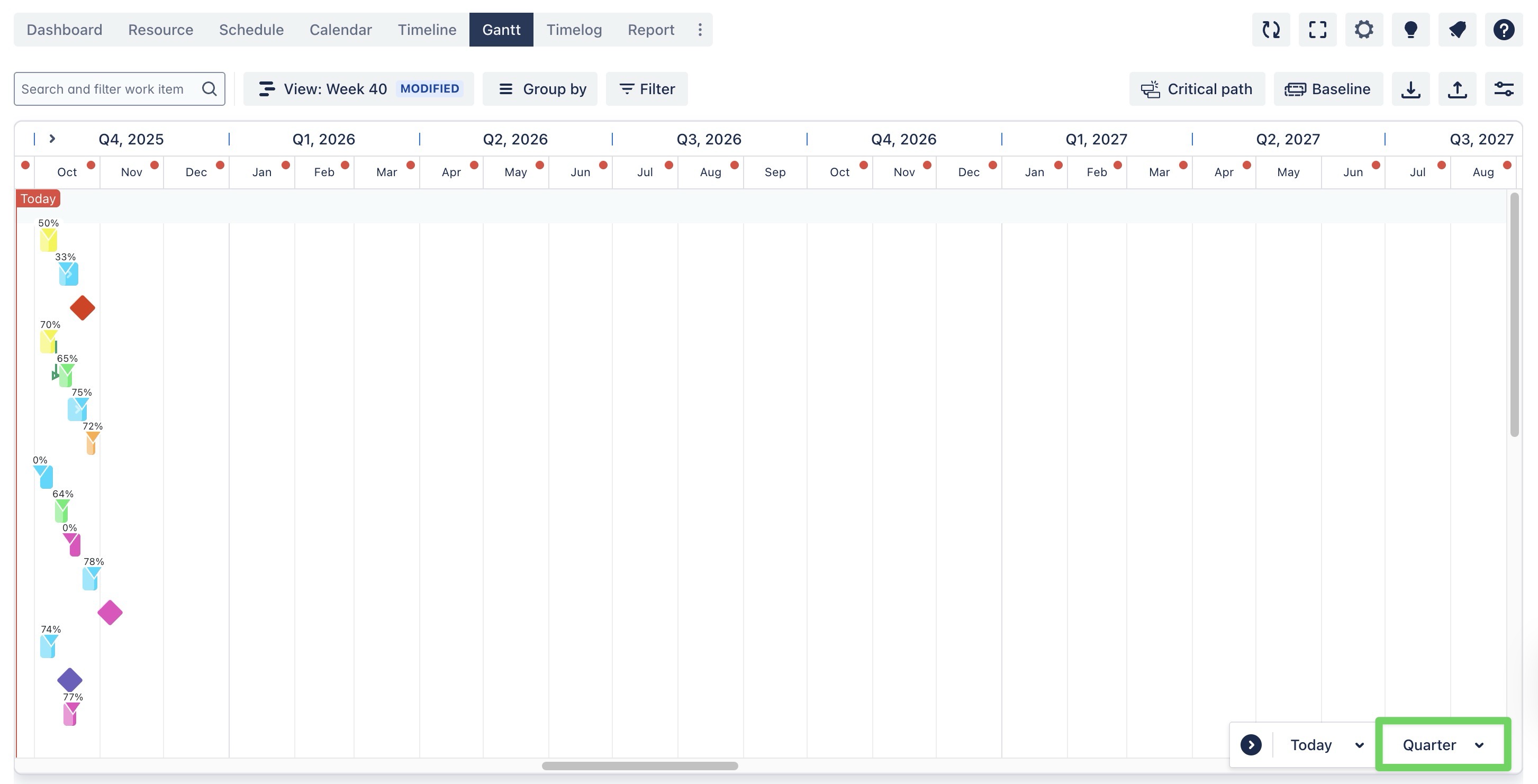 In Timeline & Gantt Board, you can adjust the time scale to see your tasks and projects by weeks, months, quarters, or years with a single click.