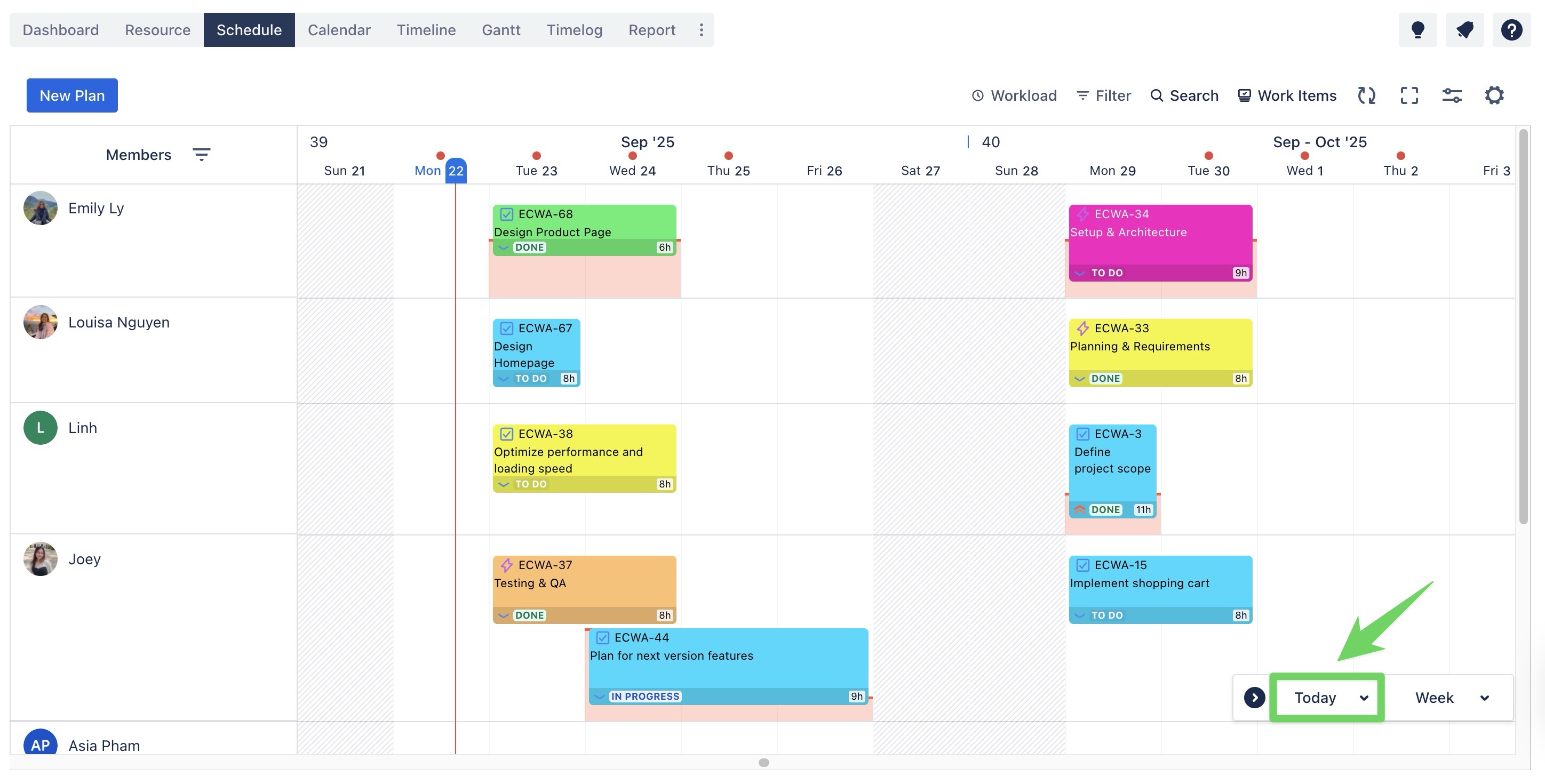 The "Today" Button ensures users can quickly return to the current day or week, regardless of where they are on the board.