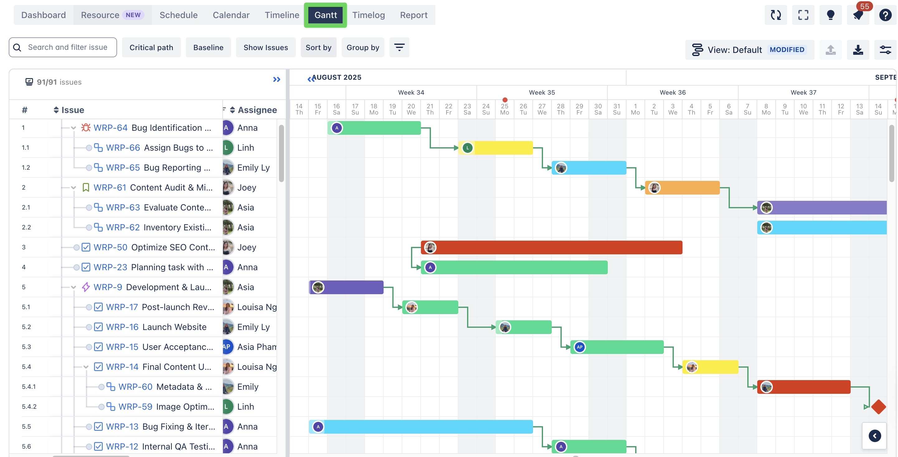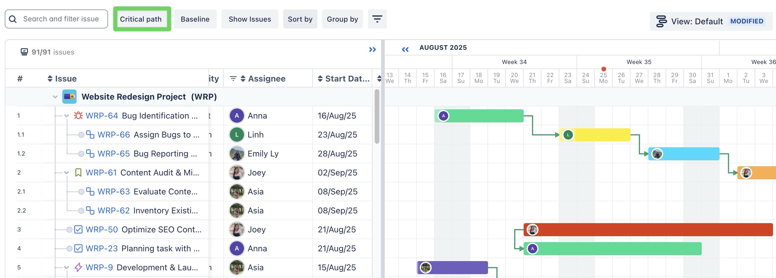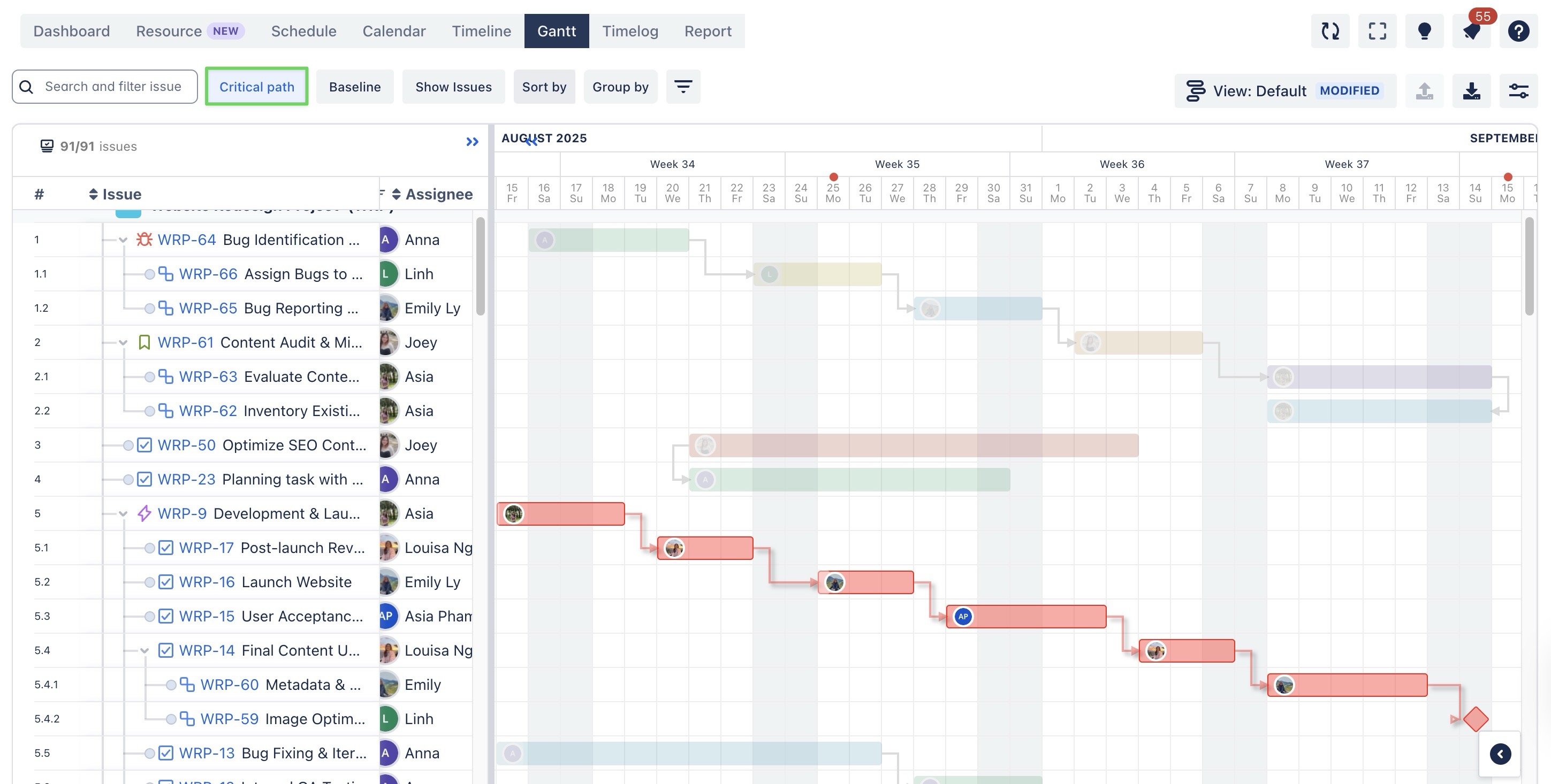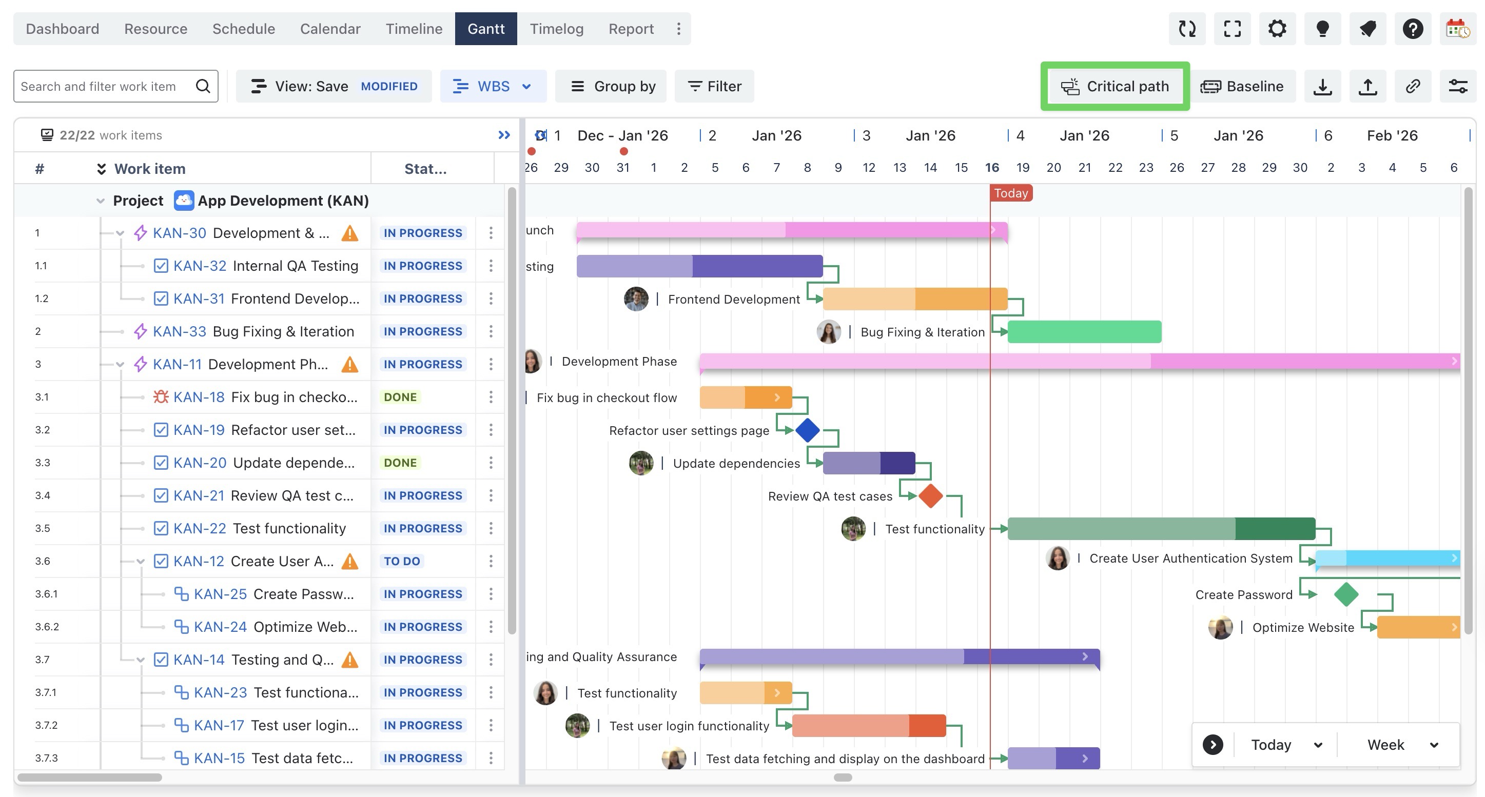 The application will automatically highlight the Critical Path, showing the sequence of tasks that directly impact the project's completion date.