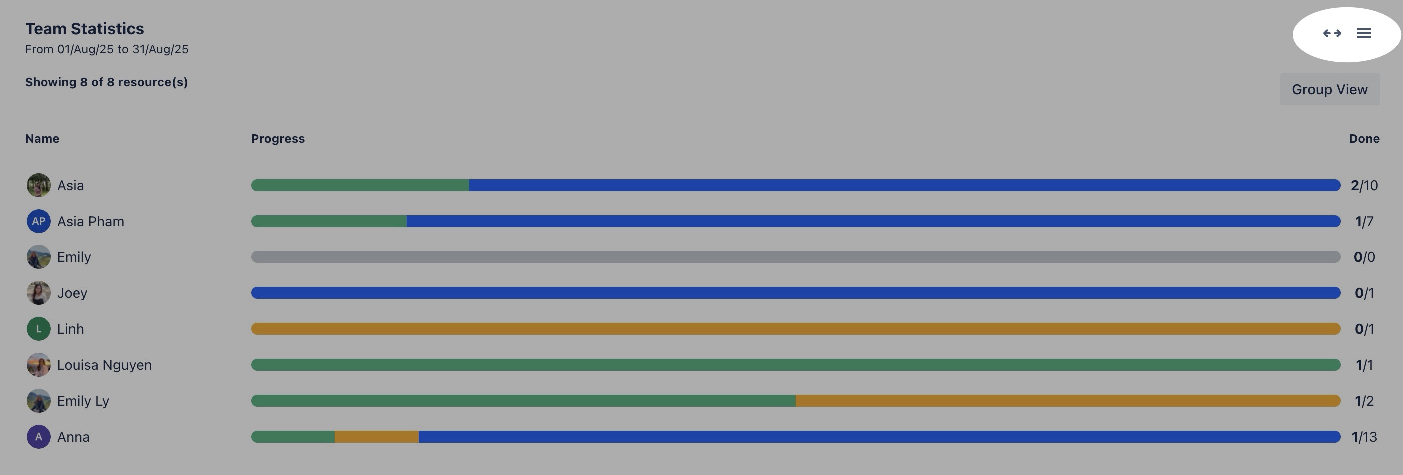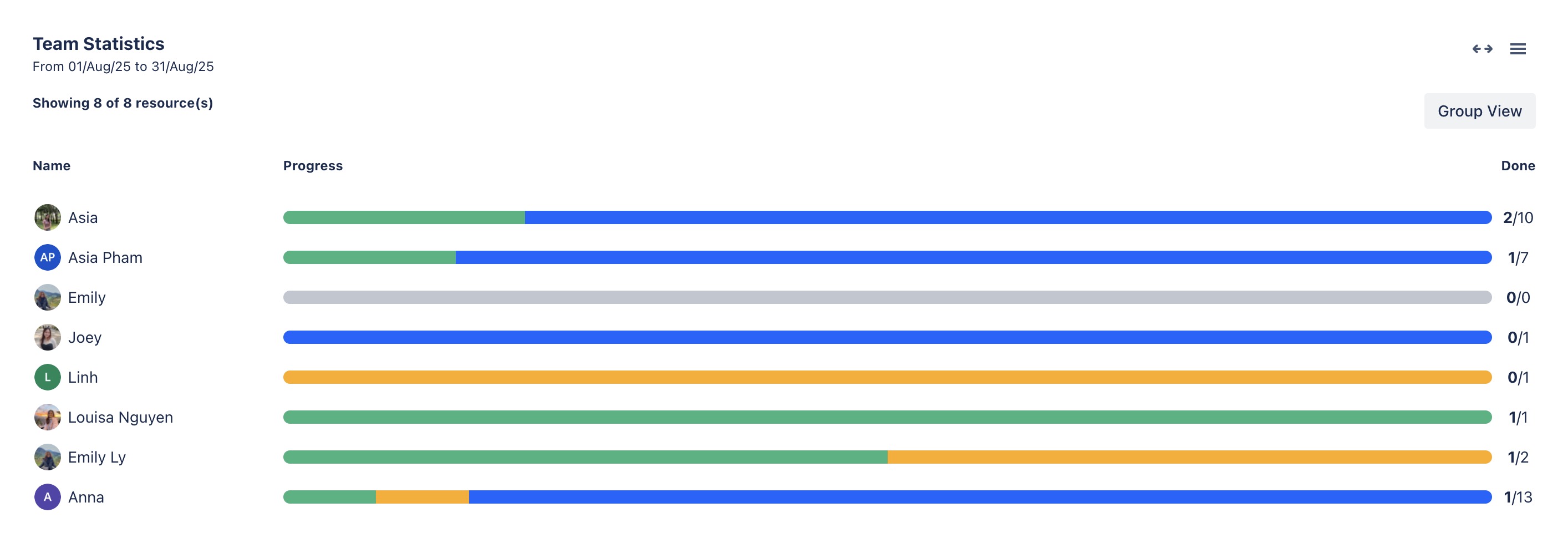 The Team Statistics view provides an overview of how individual team members are progressing with their assigned tasks, using a color-coded progress bar:
