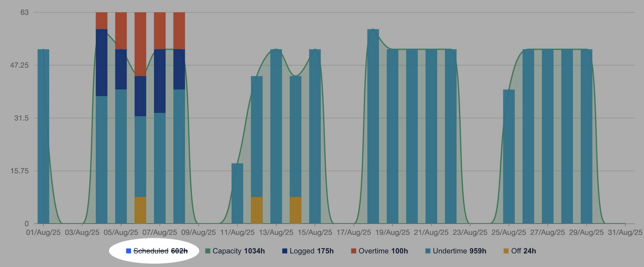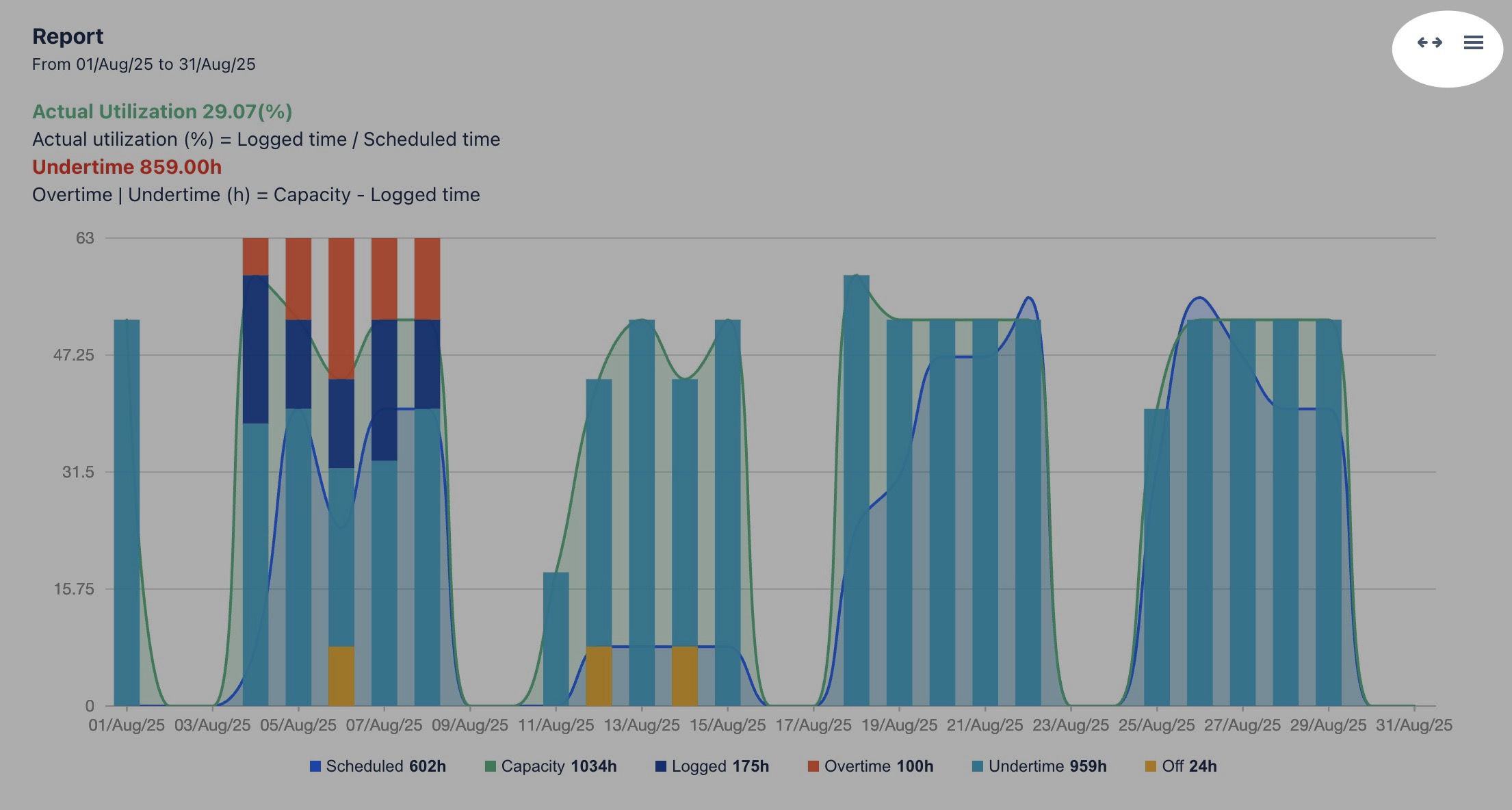 Undertime | This represents the logged hours that are less than the capacity |