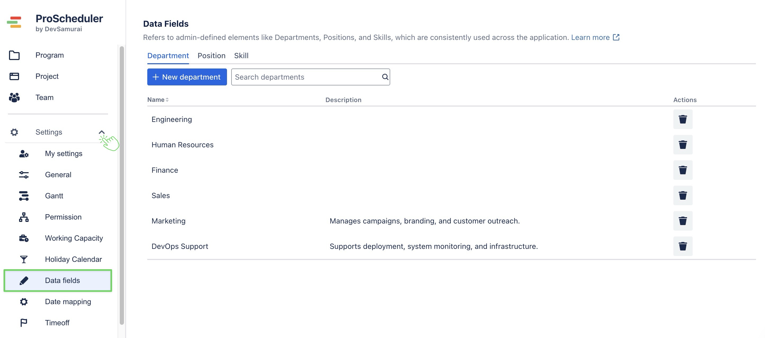 icon next to the department you want to delete.A confirmation dialog will appear: click Yes to confirm.