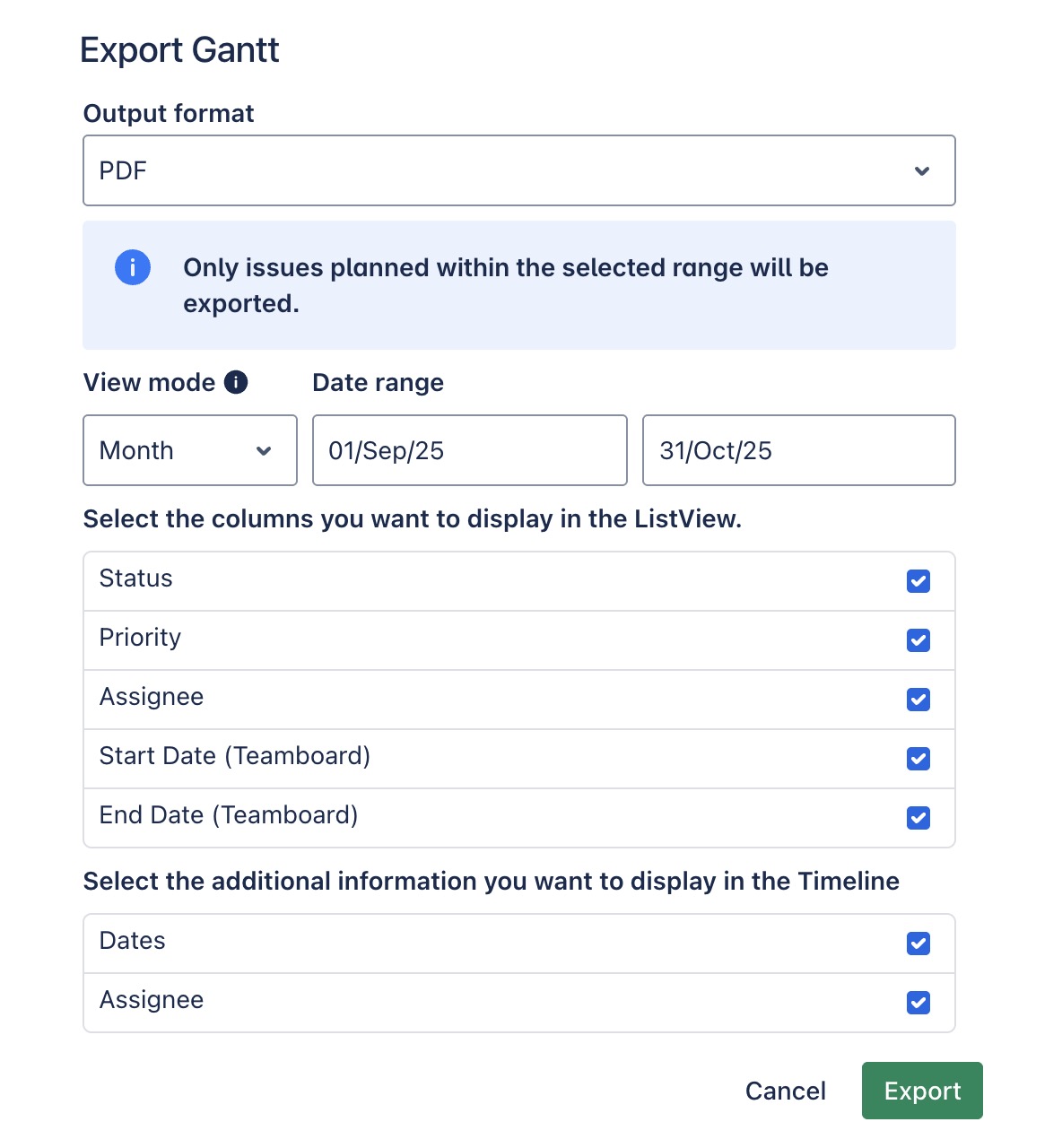 Under Timeline, choose additional information (e.g., Dates, Assignee) to include in the timeline section of the PDF.