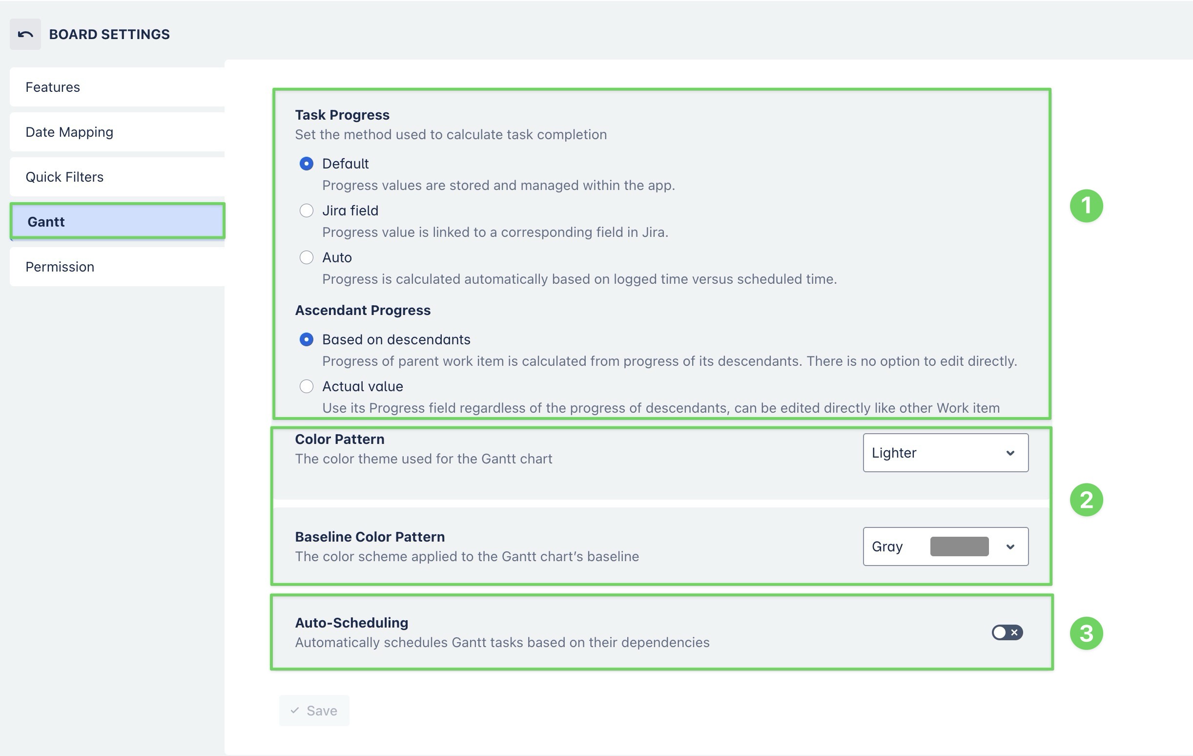 Progress settings: Configure how task completion is tracked and displayed on the Gantt chart. Determine how the progress of parent tasks (ascendants) is calculated.